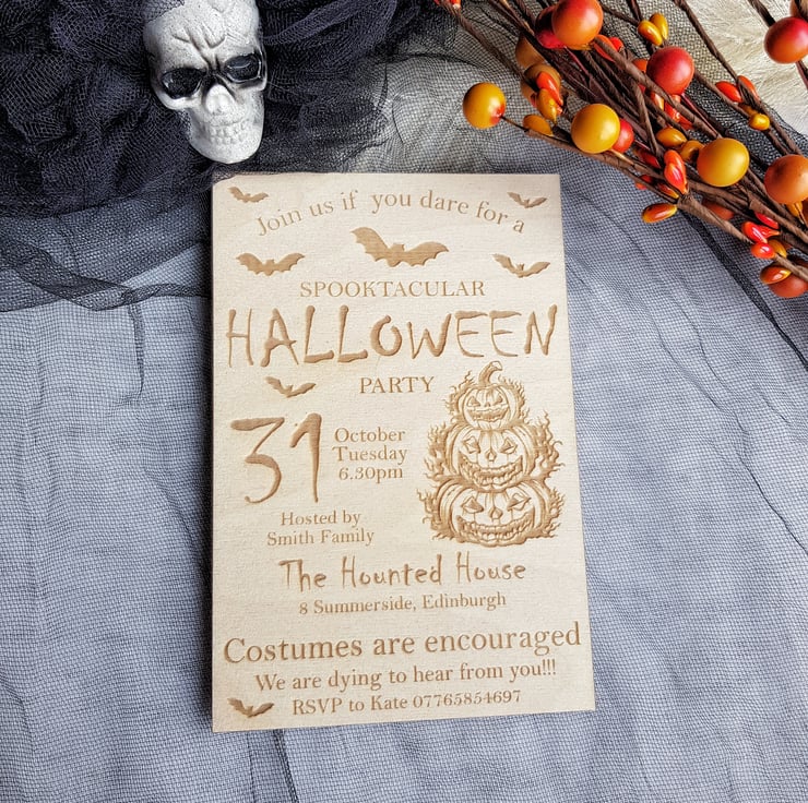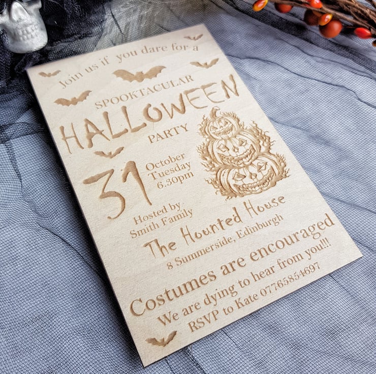 With intricate designs and unparalleled attention to detail, these invitations emerge as true standouts, capturing the essence of the Halloween spirit. Whether you're throwing a haunted house gathering or a chilling costume party, our wooden invitations set the perfect ambiance for your eerie soirée. Let the anticipation of a thrilling night begin the moment your guests receive these exceptional invites!