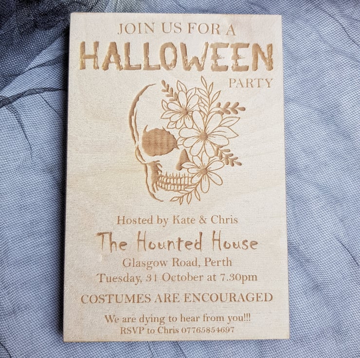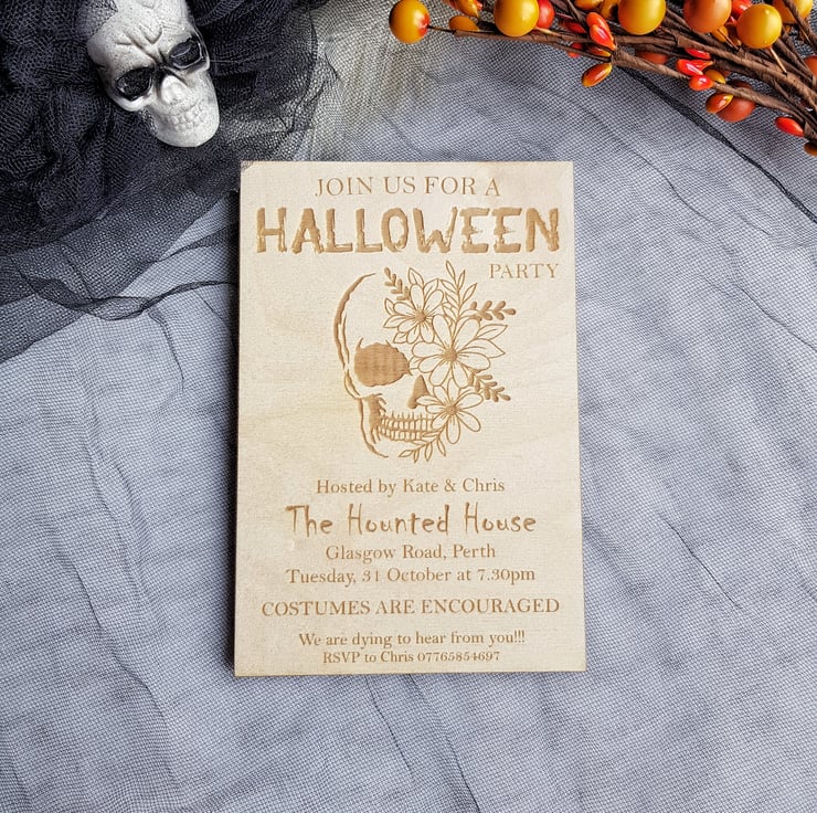 Rustic Personalised Halloween Wooden Invitation - Creepy Skull Party Invites