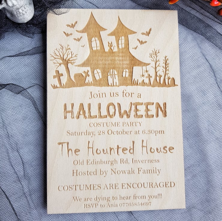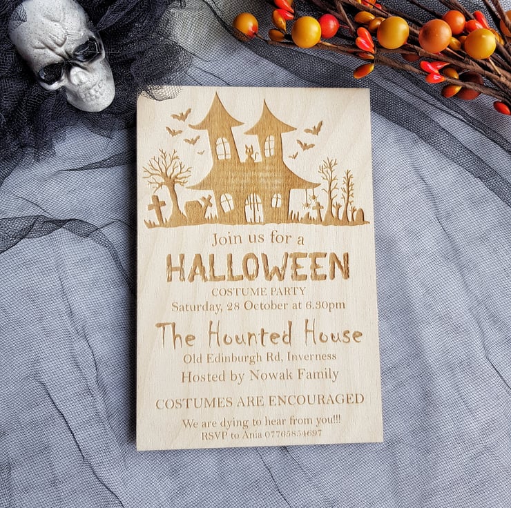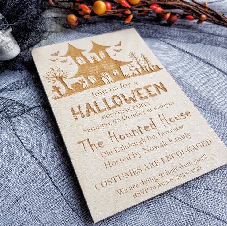 With intricate designs and unparalleled attention to detail, these invitations emerge as true standouts, capturing the essence of the Halloween spirit. Whether you're throwing a haunted house gathering or a chilling costume party, our wooden invitations set the perfect ambiance for your eerie soirée. Let the anticipation of a thrilling night begin the moment your guests receive these exceptional invites!
