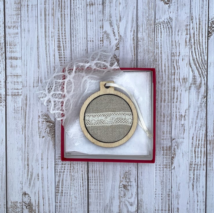 A delicate strip of upcycled vintage lace on linen, mounted in a very petite mini hoop – 2.25” x 2.75" (approx 6 cm x 7 cm).