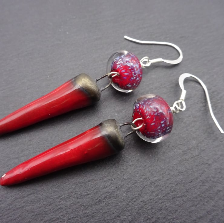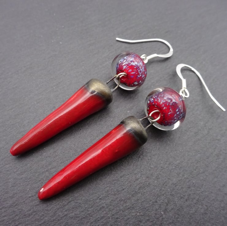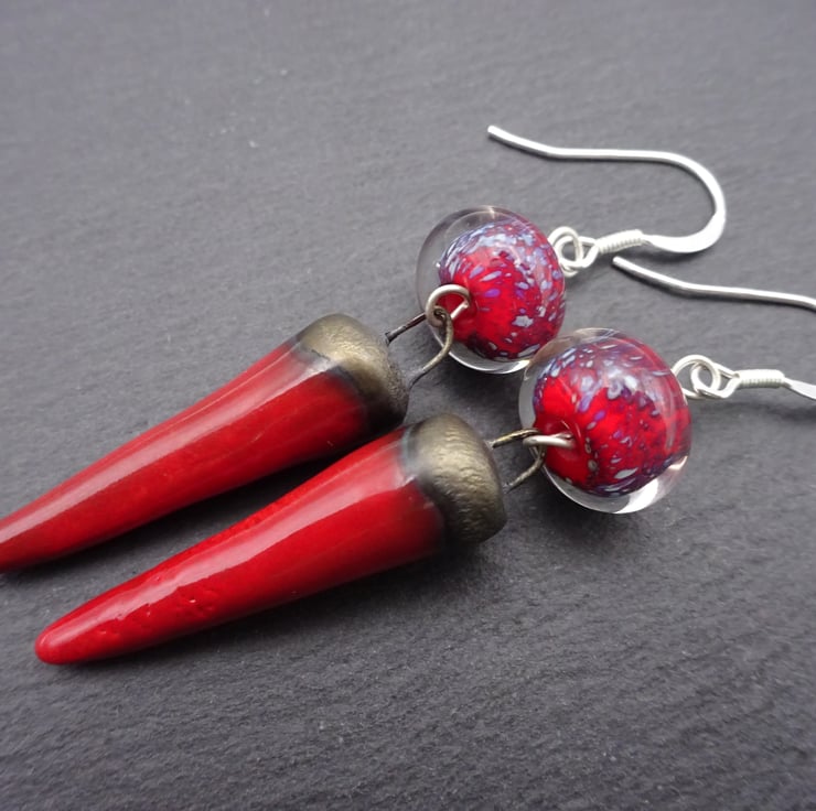 A pair of earrings made with sterling silver ear wires, handmade lampwork glass beads and handmade ceramic spikes with a red glaze.