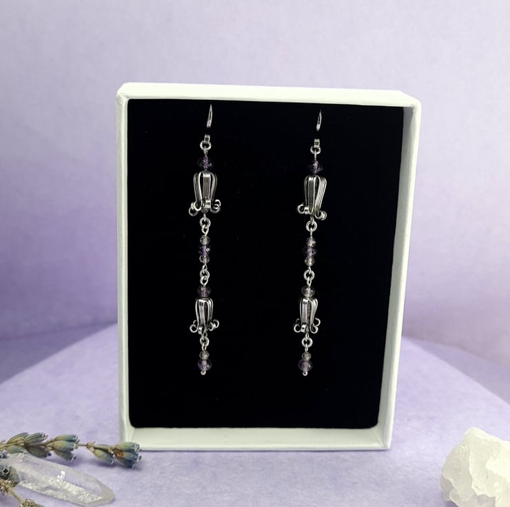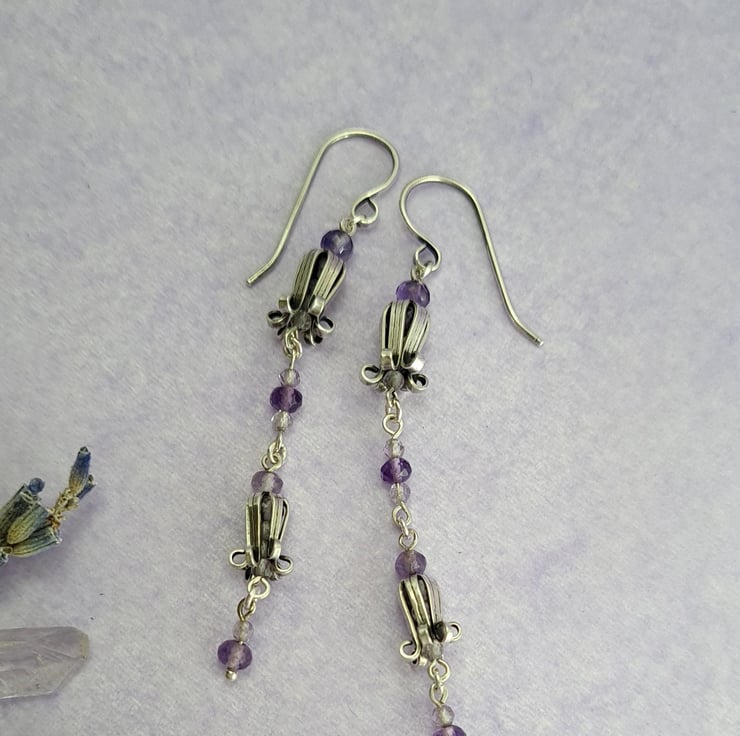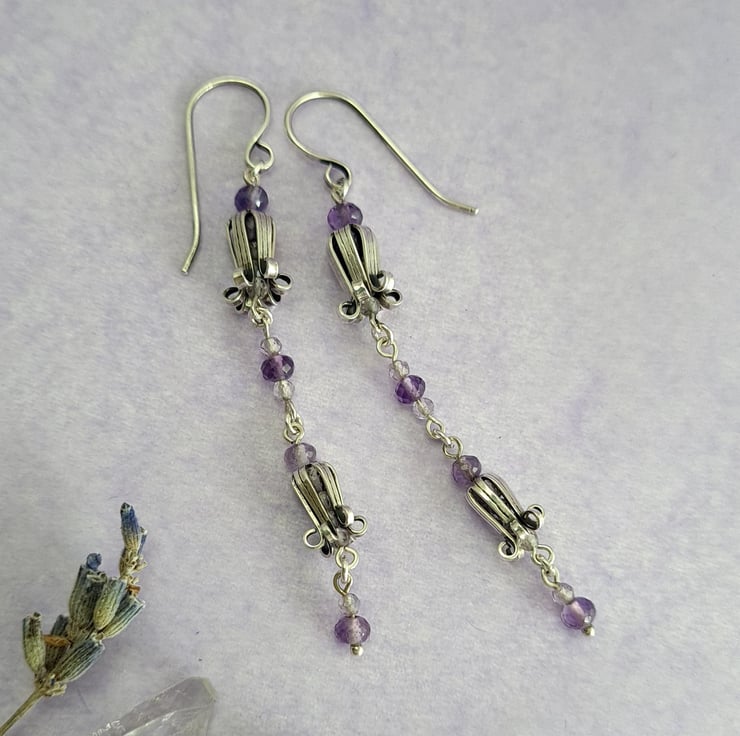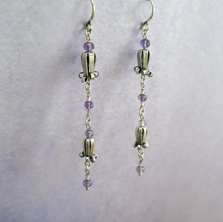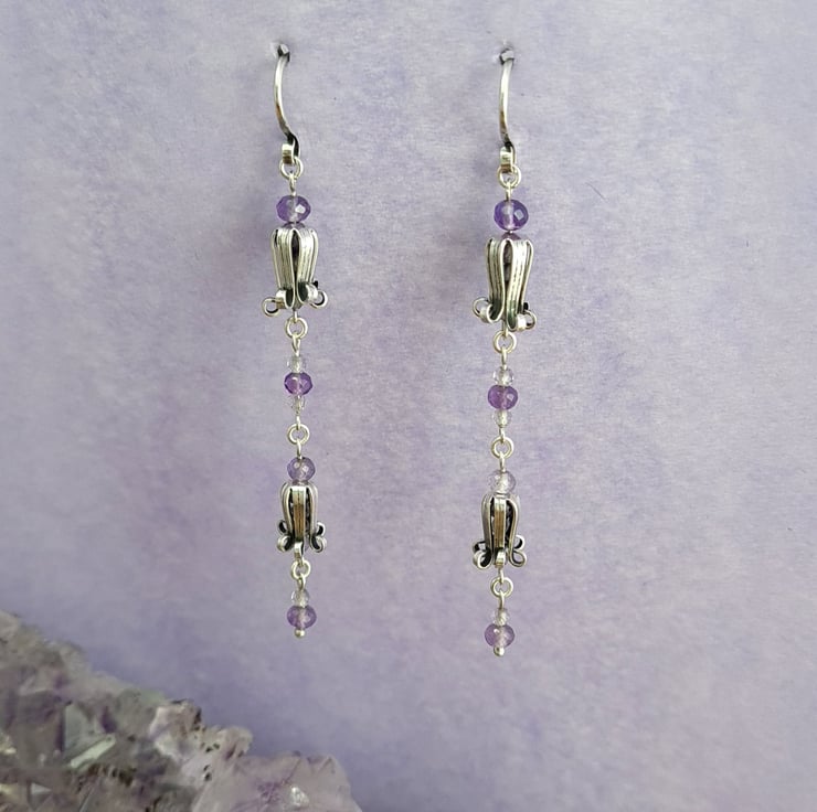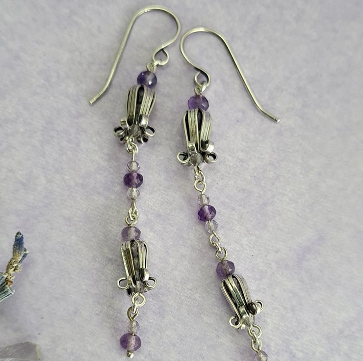These earrings are very dainty and pretty. The bluebells are handmade using sterling silver sheet and have beautiful micro faceted light amethyst beads inside them to give a lovely sparkle. To contrast I've used multi toned micro faceted Amethyst beads for the links. They measure 65mm drop.
