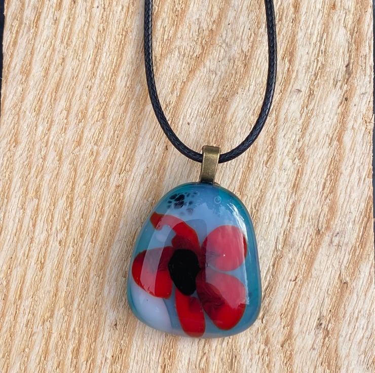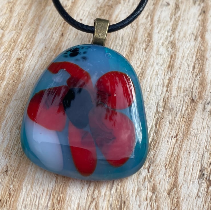 This stunning glass fused pendant has an eye catching poppy design. Presented with an antique coloured bail on a simple waxed cord necklace. The pendant measures approximately 1 1/2 inches