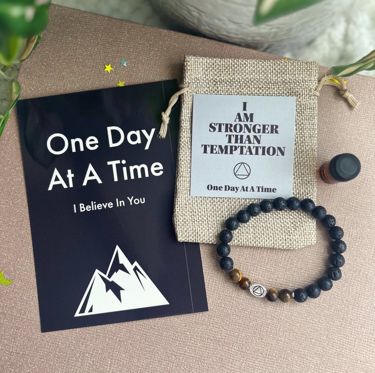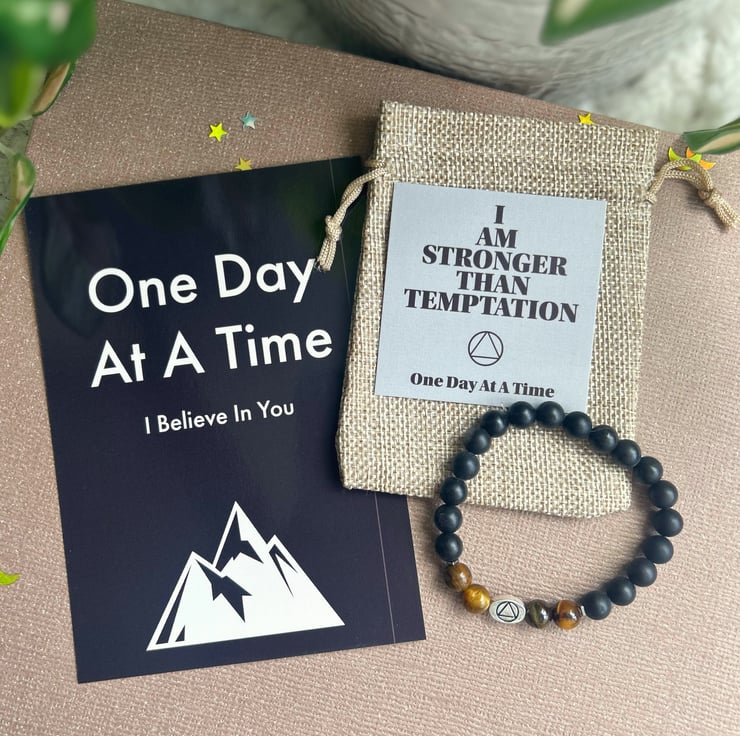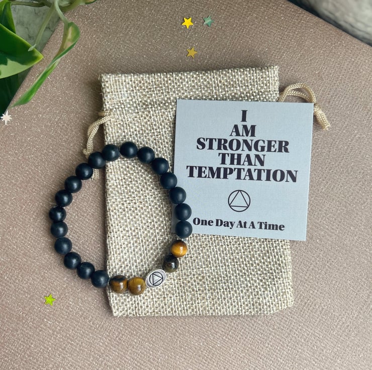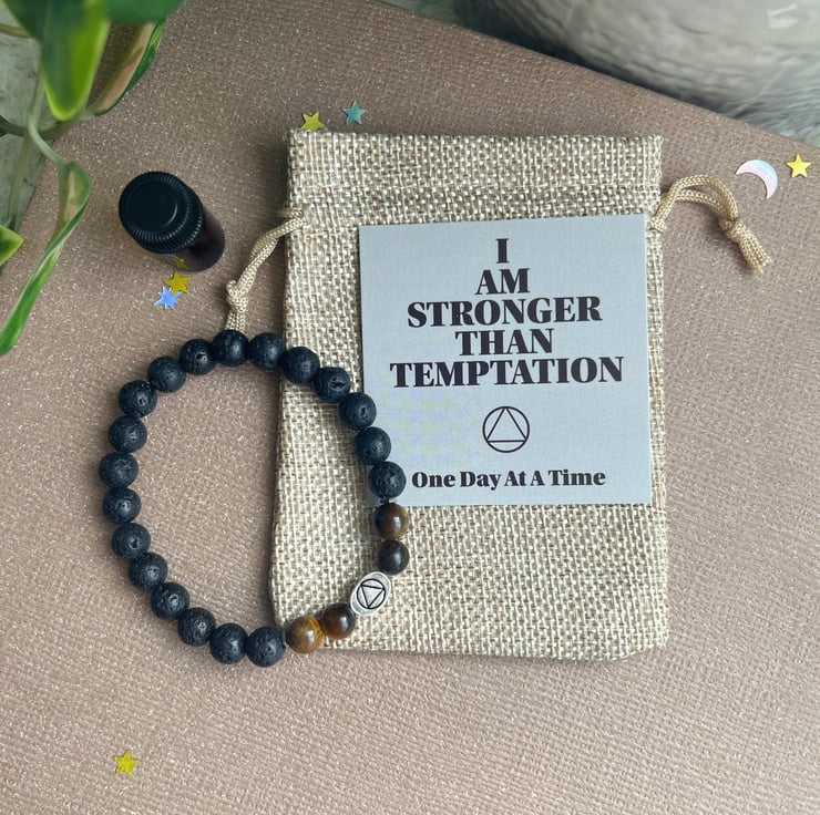 This handmade Alcoholics Anonymous Bracelet, has the AA symbol on a silver charm and is made from tiger eye beads and a choice of either lava bead which diffuse essential oil throughout the day to promote relaxation.( Comes with a 2ml bottle of high quality Lavender essential oil to use with the bracelet) Or made from black stone beads. Also comes with a “I am Stronger than temptation” sobriety backing card I have designed and a A6 One Day At A Time postcard I have designed. Gift wrapped!
