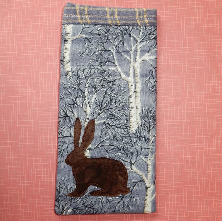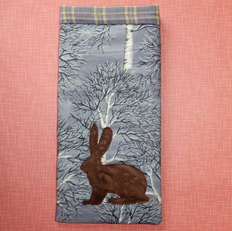 A beautiful brown hare sits in front of the trees on this pretty slip -in -style glasses case (there is a hare on both the front and the back). There is a toning plaid trim and lining. It is made from cotton print fabrics, the hare is made from mottled brown fabric and has been appliqued on, and it has a firm layer of wadding to protect your glasses or sunglasses. This is a slip in style glasses case, if you require a case which fastens please view my other listings.