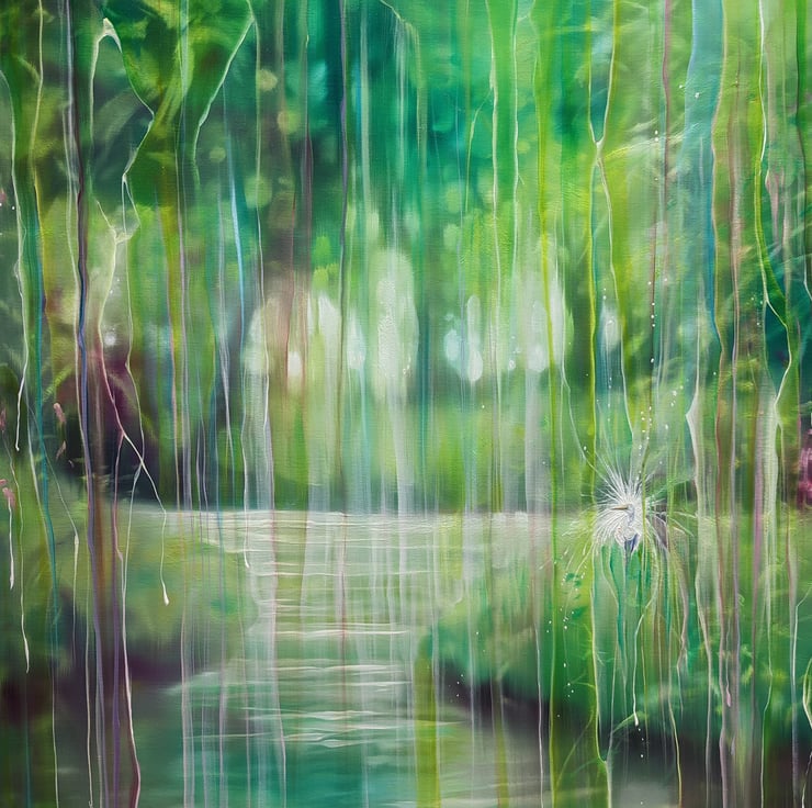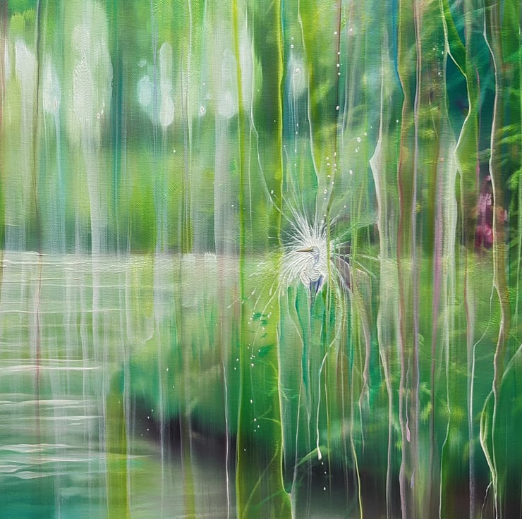 The inspiration was a walk I took along the river Medway near Tunbridge Wells in June where white egrets can often be seen against the green willows and riverbank reeds and flowers. Despite this being quite a common sight, these birds are very beautiful and it always feels like a treat to see them. This a tribute to the luscious greens of June in the countryside and the wildlife you can spot as you walk along rivers.