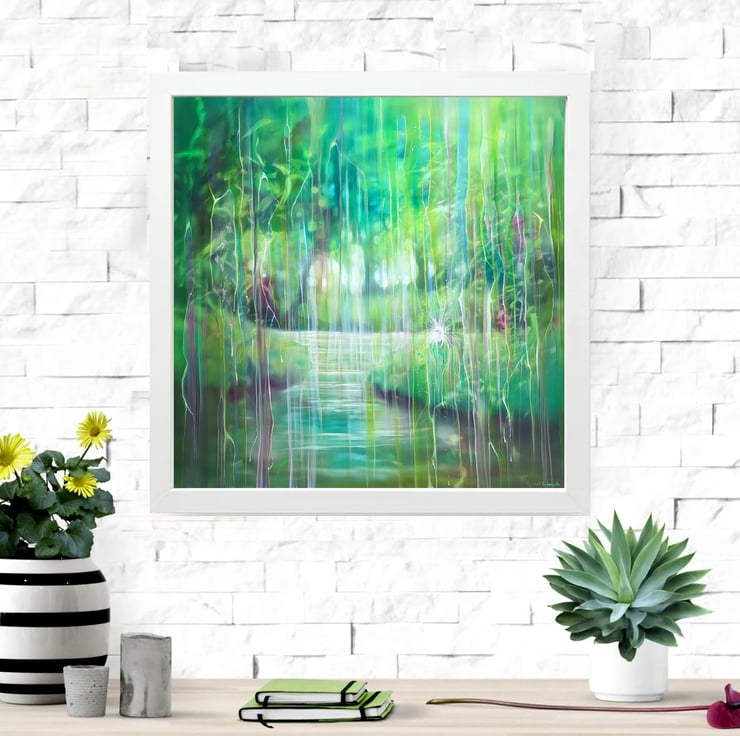 Emanation is a 30x30x2 inches framed canvas print (31.5x31.5x2 including the frame) of an original painting. It comes in a white wooden floater frame (frame with slight gap between the canvas and the frame so it appears to float). The depth of frame is 2 inches (stands out from the wall by 2 inches) and the width of frame is half an inch. The print is made with fade resistant ink. It does not come with fixings on the back but is ready to hang on nails or hooks. Note that the close ups of the frame are not the same print but are included to show what the frame looks like.