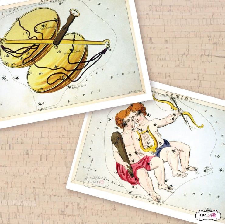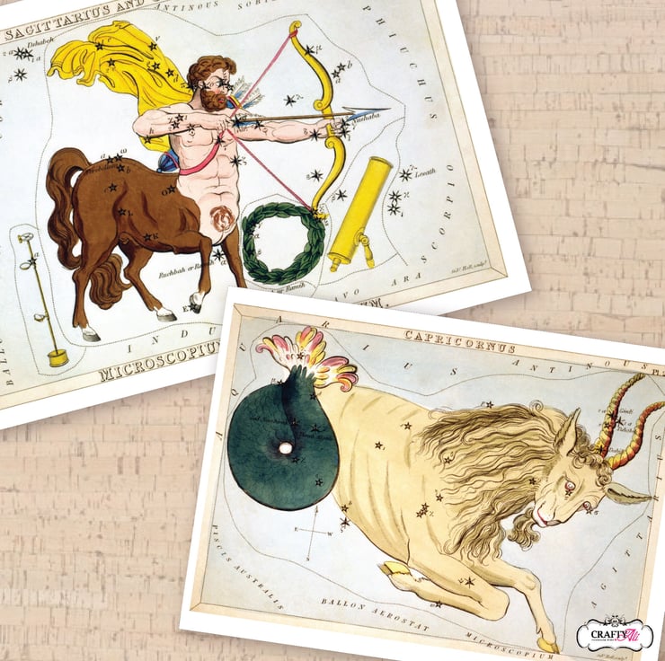 A pack of 12 printed A6 (approximately 14.85 x 10.5cm) notecards with a constellation / astrological theme. There are 12 different cards representing each of the zodiac constellations and based upon illustrations by British cartographer, Sidney Hall. The cards are single sided. Printed onto matt 350gsm card. See photos for details.