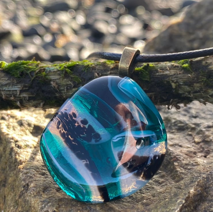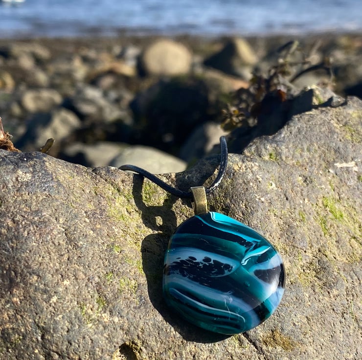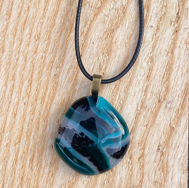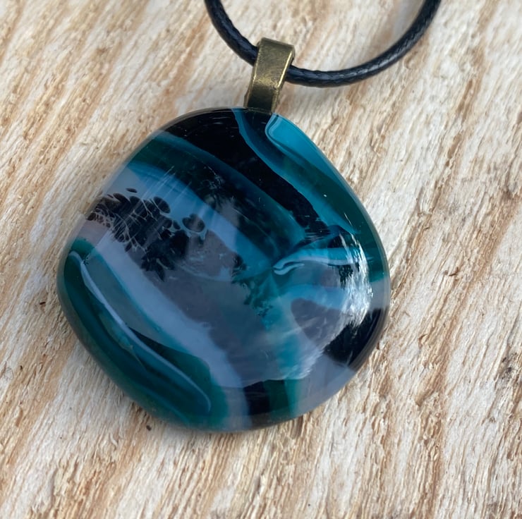A striking glass fused pendant in dark jade and black colour ways. Presented with an antique colour bail and a simple cord necklace. Pendant measures approximately 1 1/2 inches