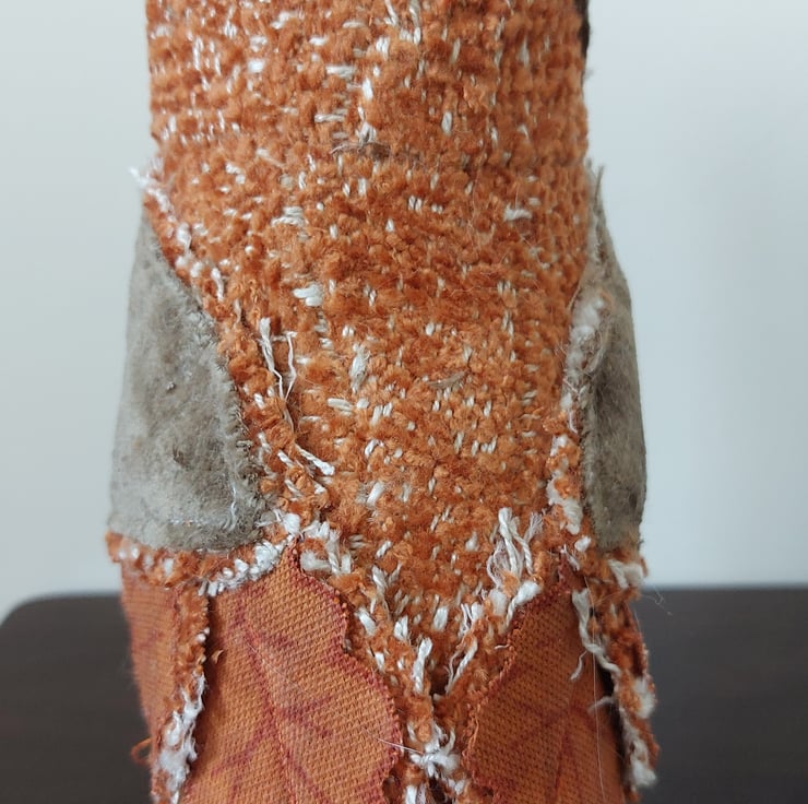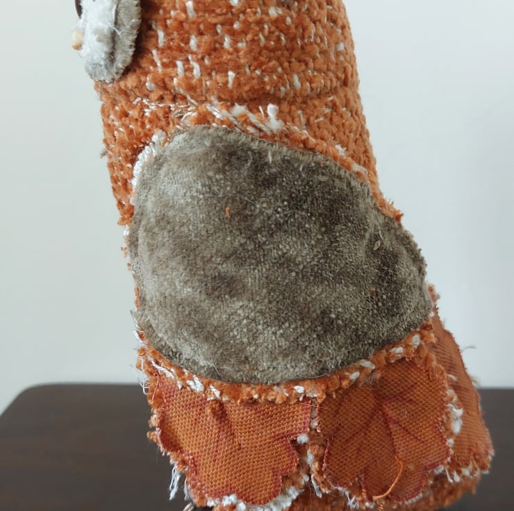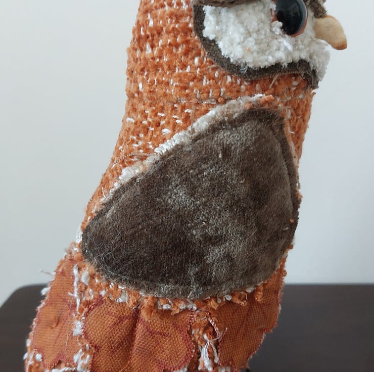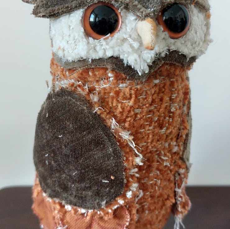 This quirky textile owl sculpture has been hand crafted using fabric remnants and other recycled materials. Freestanding approx 18cm in height. Please note that this is not a toy.