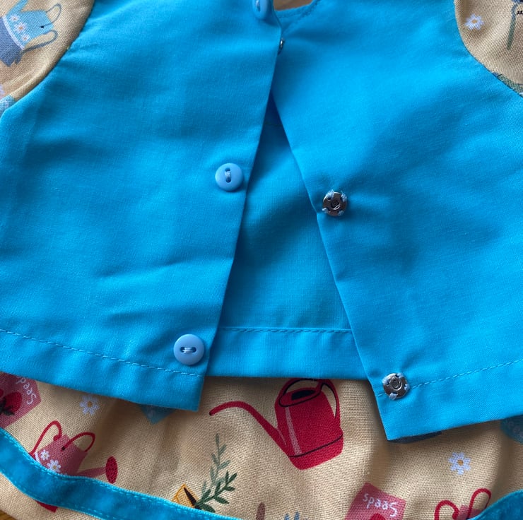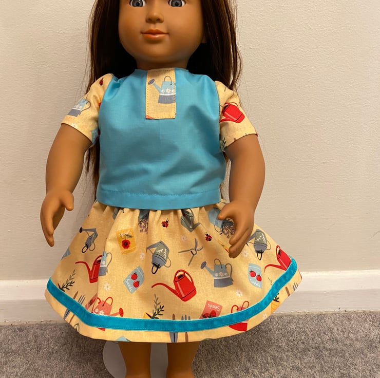 Dolls skirt and matching top. A fun outfit with a gardening theme. The skirt fabric is all out items from the garden, the top coordinates with the skirt. Colours are bright and colourful.