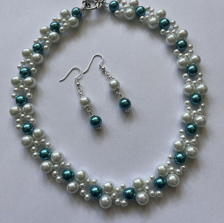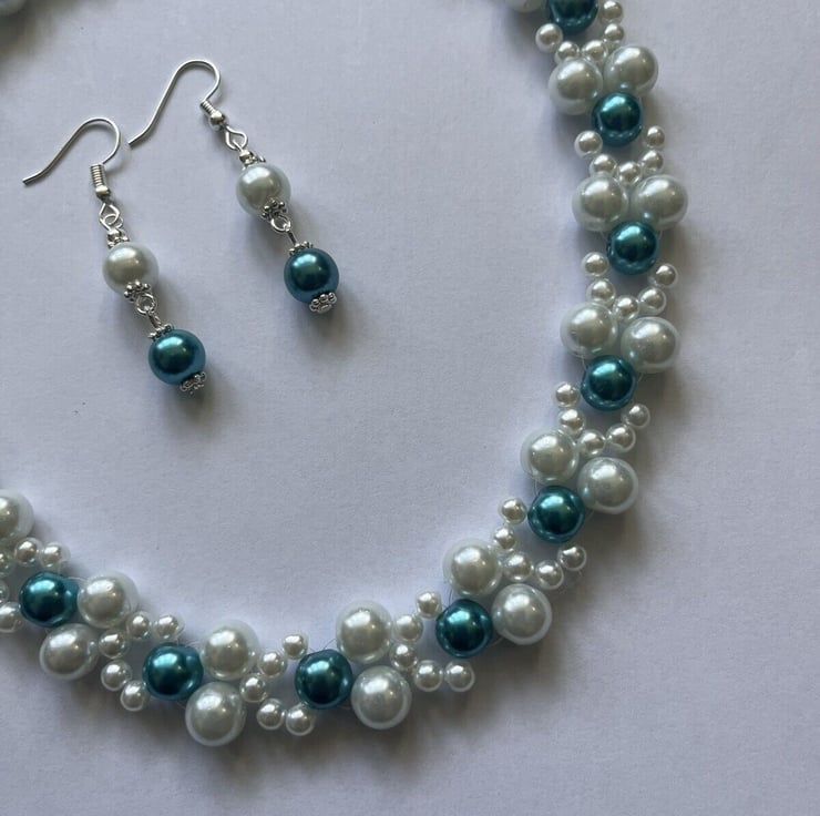 white and teal pearl bead necklace set 16" tbar fastening womens earrings glass