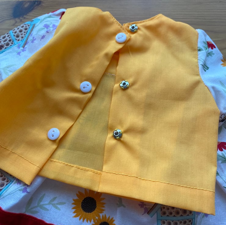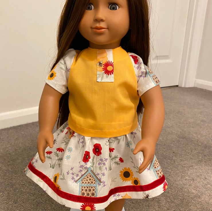 Dolls skirt and matching top with a sunflower & bumble bee theme. The outfit is fun and cheerful. Colours are warm and bright. The skirt and sleeves of the top are in the sunflower/ bumblebee print. The skirt has an elastic waist and trimmed with velvet ribbon.