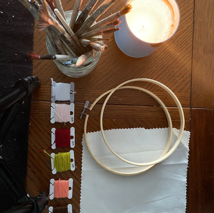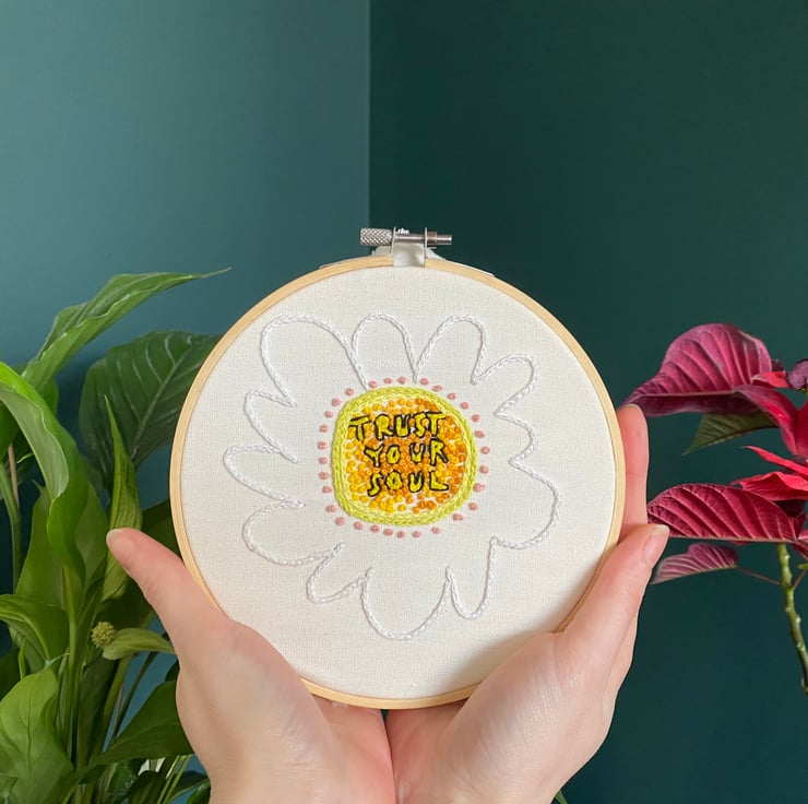 As a ready made completed hoop. Your embroidery piece has been hand stitched onto organic fabric and framed in a 6 inch bamboo hoop. It comes backed with felt and ready to display on your wall or on a shelf.