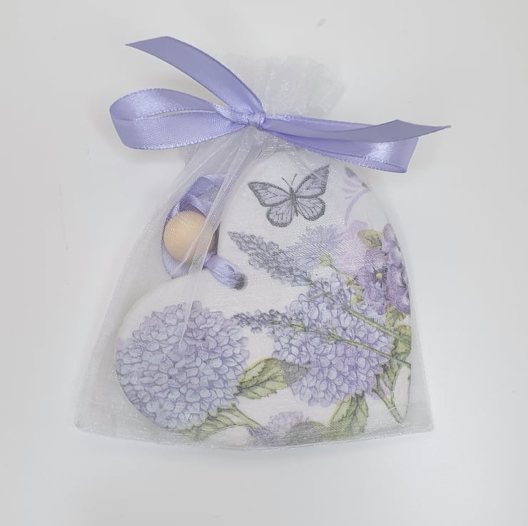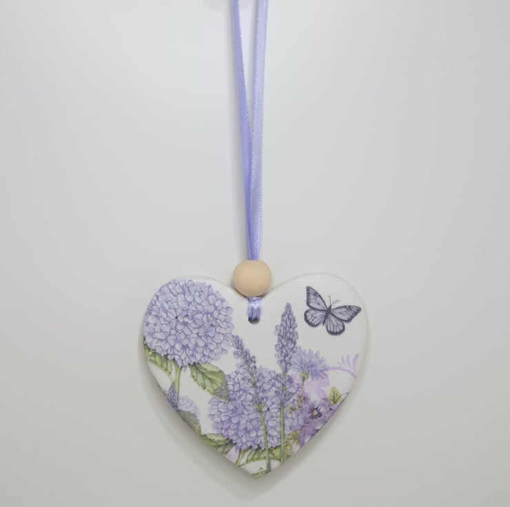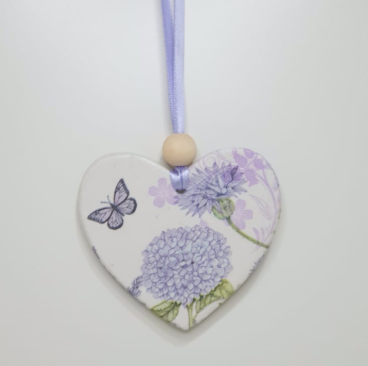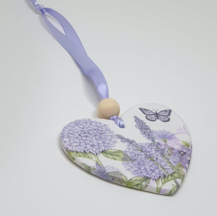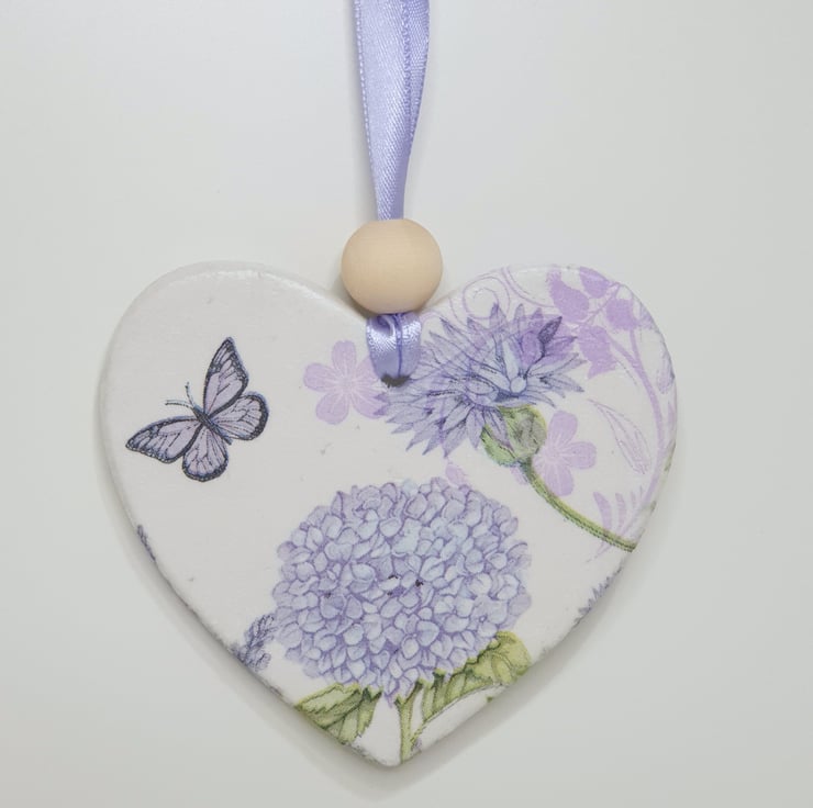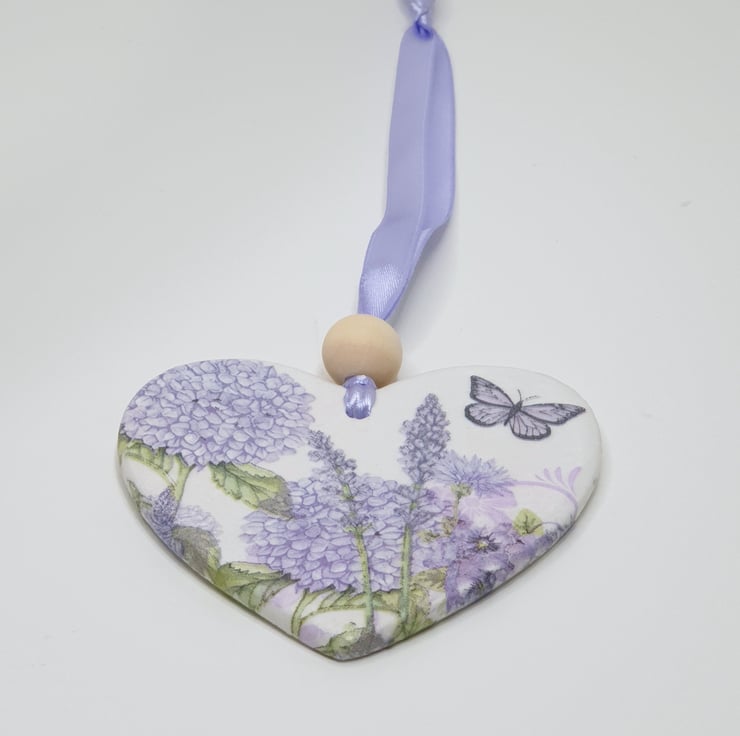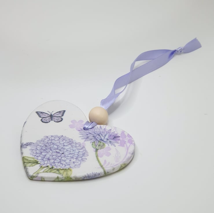 Pretty wildflowers double-sided clay heart decoration perfect for hanging in a window, from a handle or piece of furniture. This decorartive heart has been handmade from airdry clay and decoupaged with a different purple wildflower and butterfly design on each side. The heart has been sealed and finished with a wooden bead and comes ready to hang with lilac satin ribbon. This pretty decoration would make a lovely gift and comes packaged in an organza bag tied with lilac ribbon.