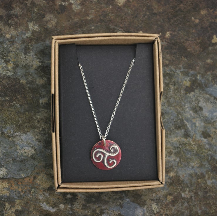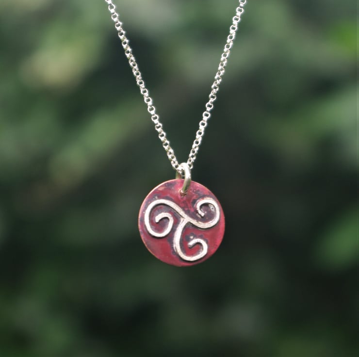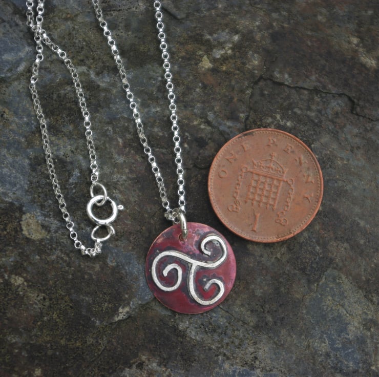 A Celtic triple spiral made of sterling silver wire soldered onto a copper disc with a diameter of 15mm/just over 0.5 inches. The copper has become richer in colour with heat and preserved by polishing with an impregnating wax.