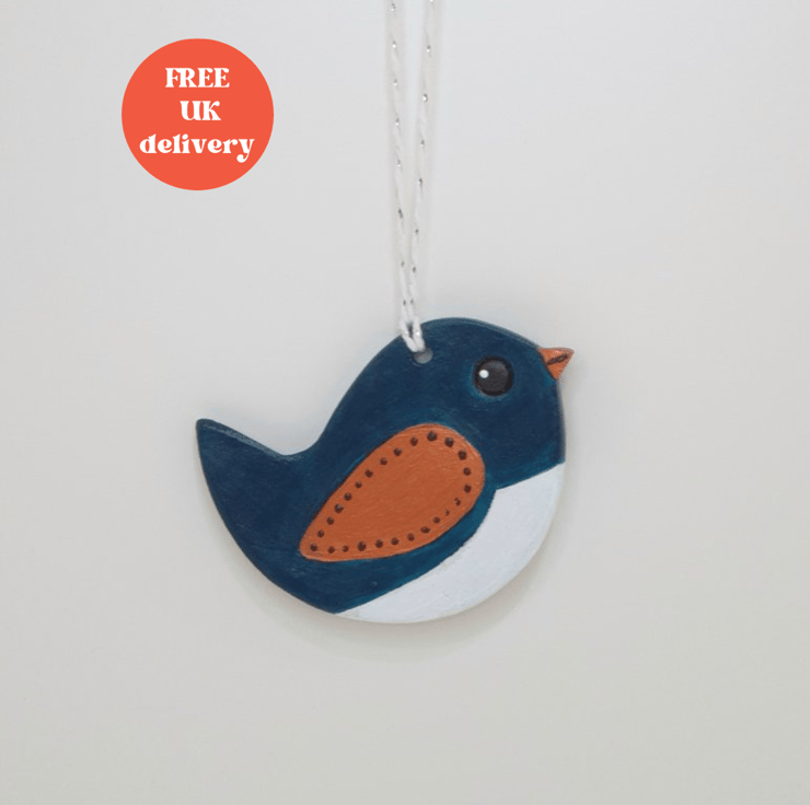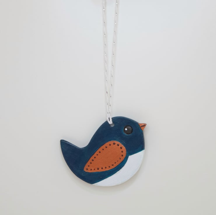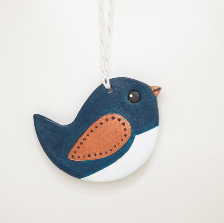 Decorative dark turquoise, bronze and white bird hanging decoration which has been lovingly created from airdry clay. This sweet bird has been handpainted on both sides with acrylics, varnished and comes ready to hang from white and silver twine. Packaged in an organza bag finished with ribbon this cute bird decoration would make a lovely gift.