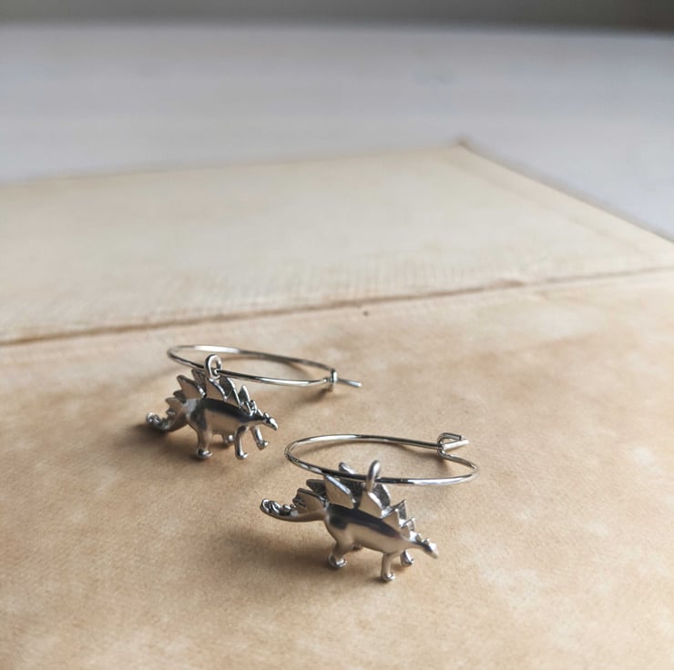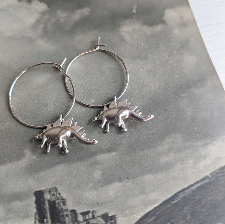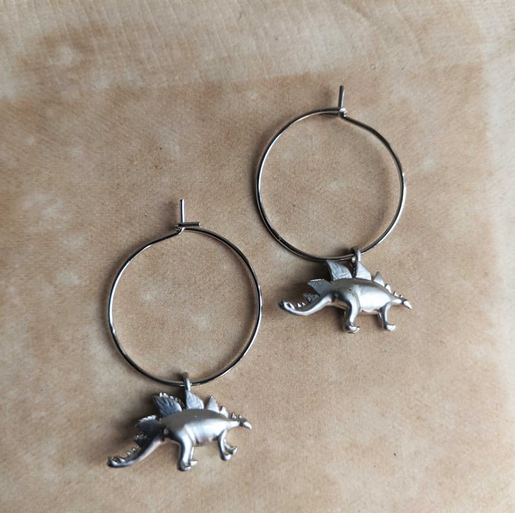Each dino charm measures 18mm long and is silver plated, as are the hooks. Nickel free. The hoops are 20mm wide.