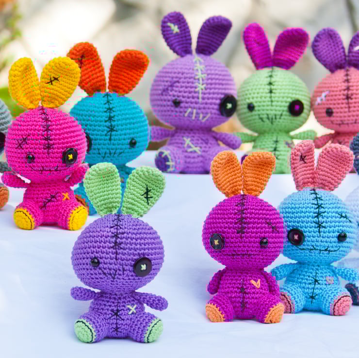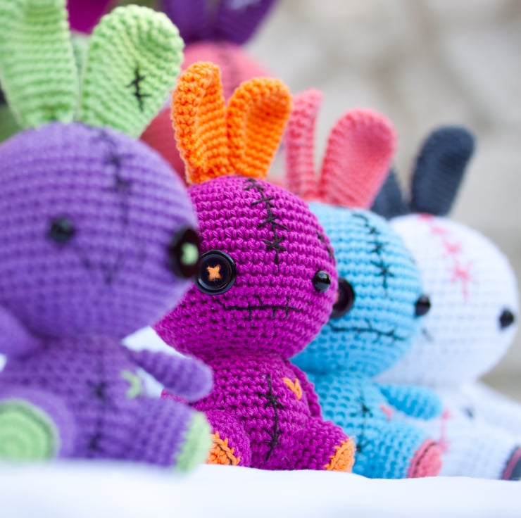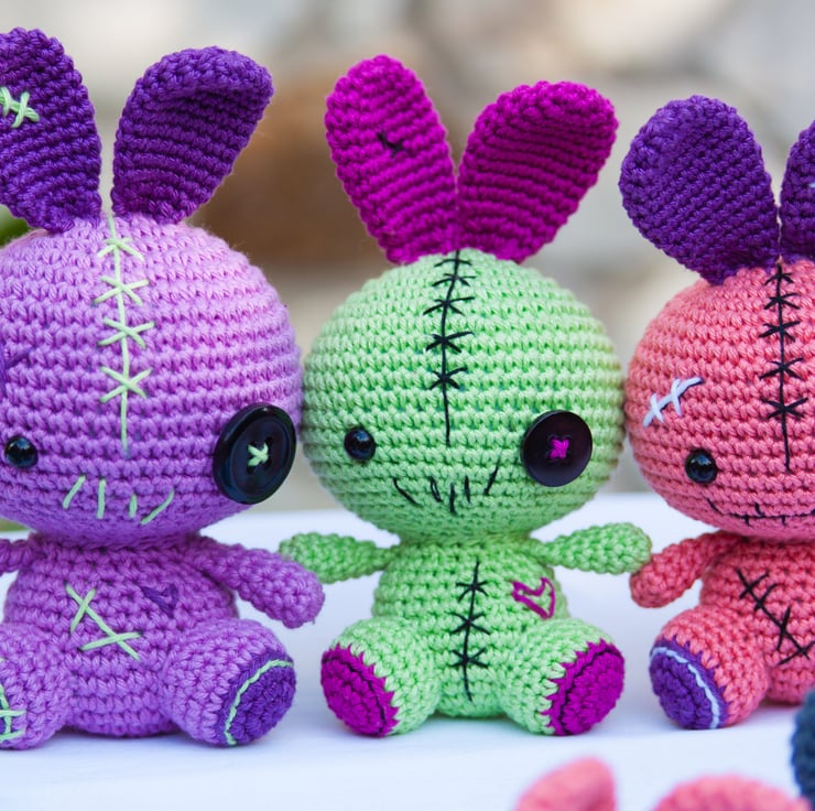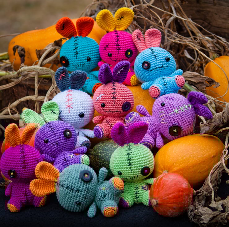 Crochet Voodoo Zombie Bunny Rabbits handmade in a variety of colours. Halloween Zombie Bunnies handmade in the UK by Julia's Crochet Cottage.