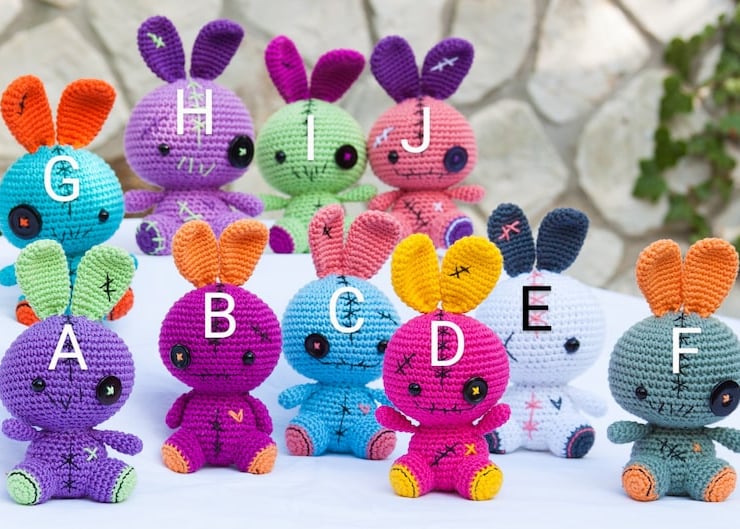 Each bunny shown is available for individual purchase. Please see the labelled image in the gallery for the corresponding colour codes for each bunny.