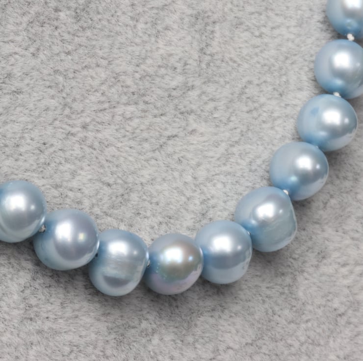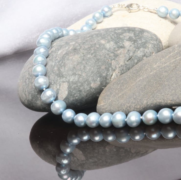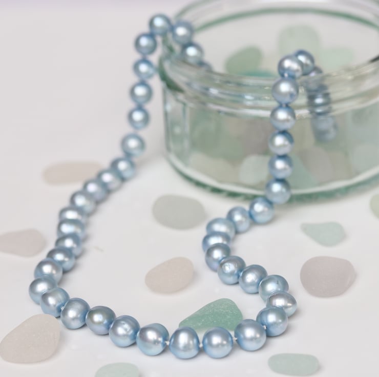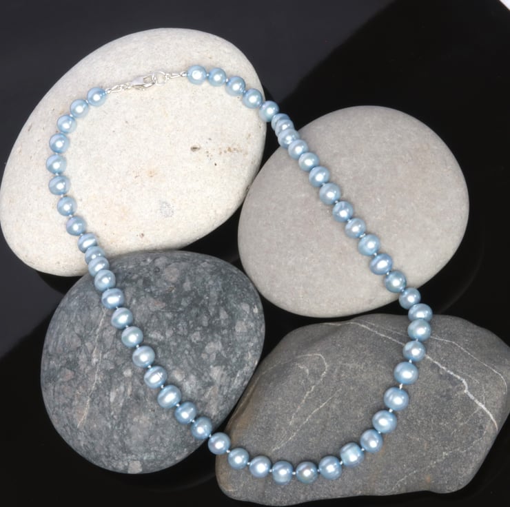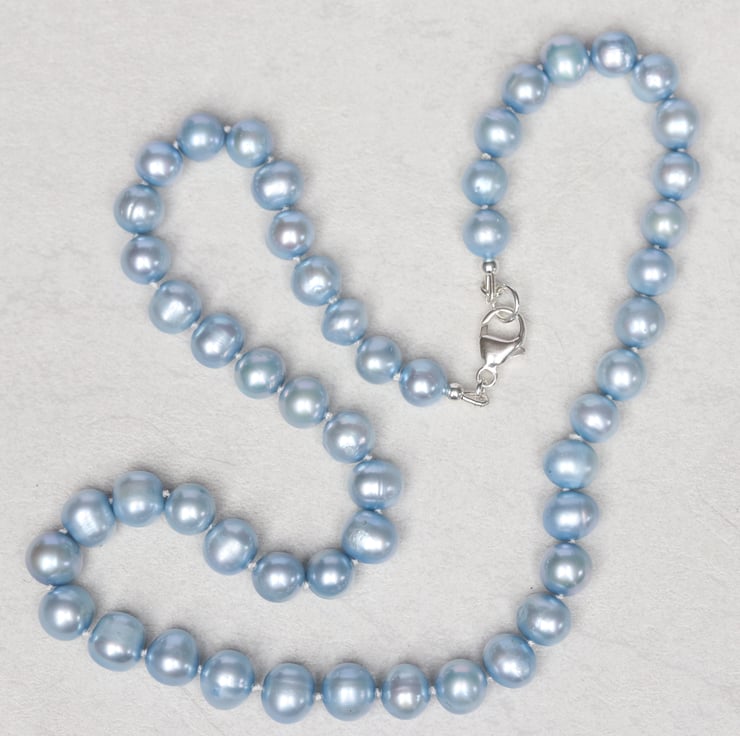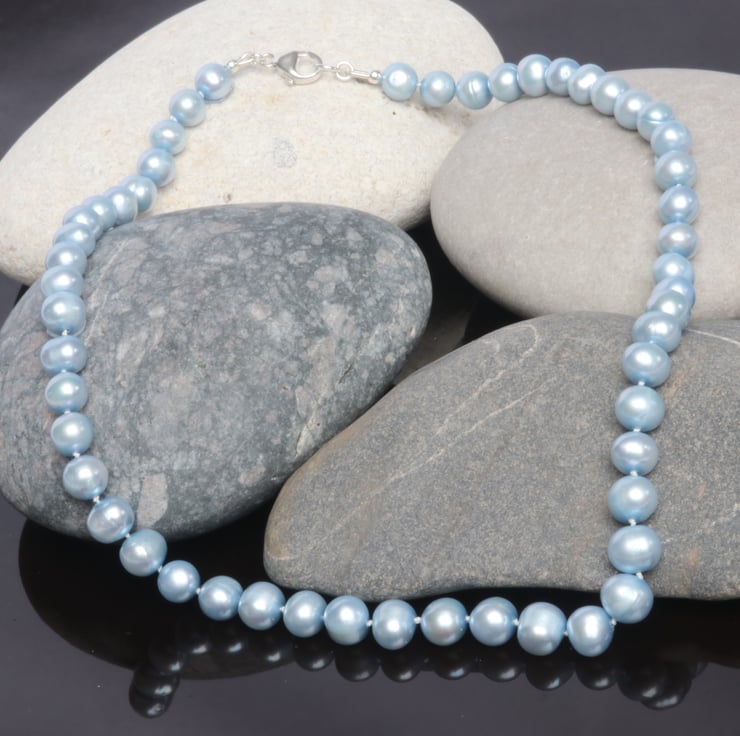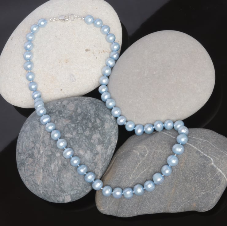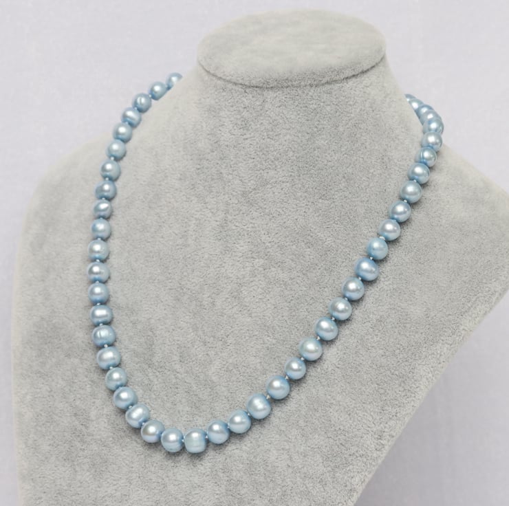 These freshwater pearls are dyed a very pretty shade of light blue and would look lovely with summer clothes or worn against a dark colour. They are slightly off round in shape; often called potato pearls. However this particular set is described as near-round. There is also a matching bracelet (item 8323053) and a pair of earrings (item 8320766) in my shop.