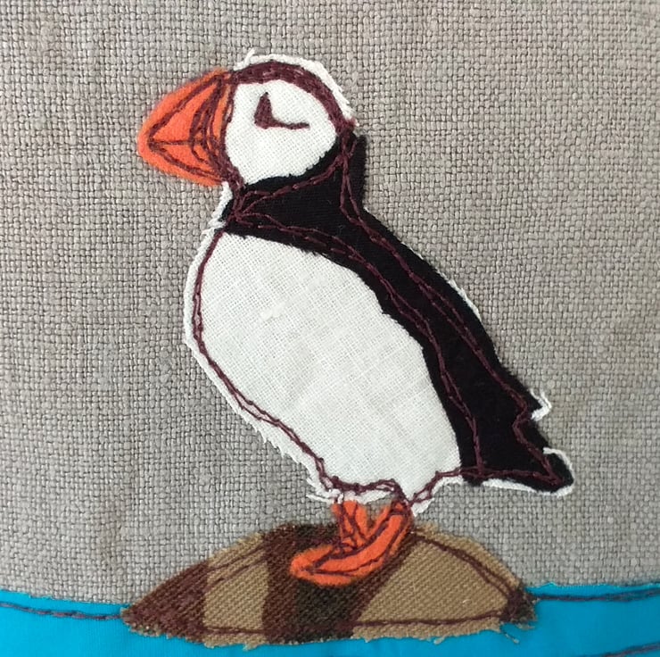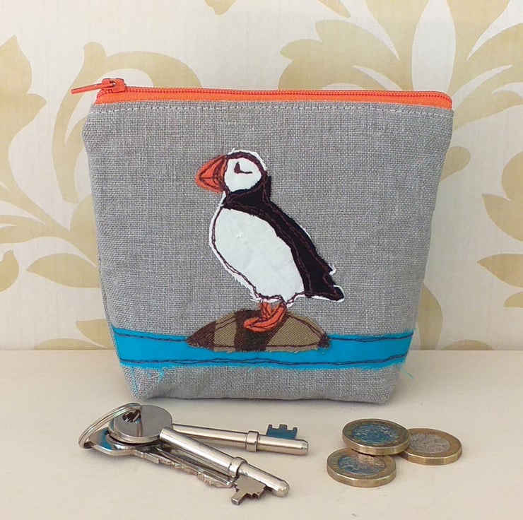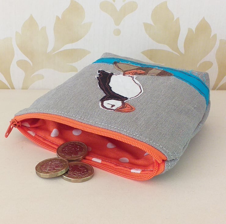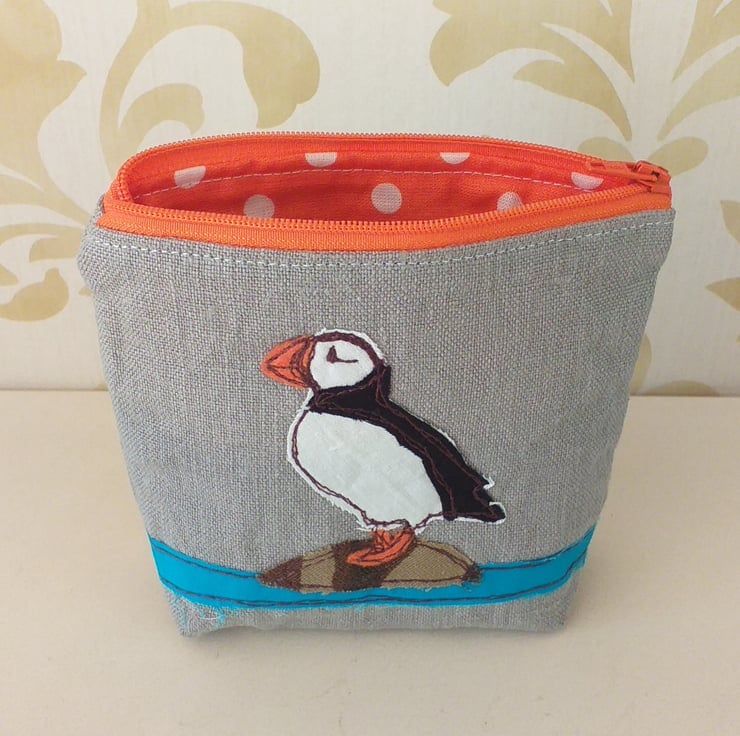 A fun coin purse with a puffin standing on a rock. The design is made by appliqueing small pieces of fabric and stitching them using free motion embroidery. The purse is made from a lovely grey linen, has a bright orange zip, matching the puffin's beak and feet, and has a bright orange spotty, cotton lining. It measures approximately 13cm wide and 12cm high, perfect for coins, cards, keys and lipstick!