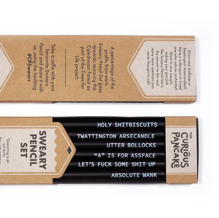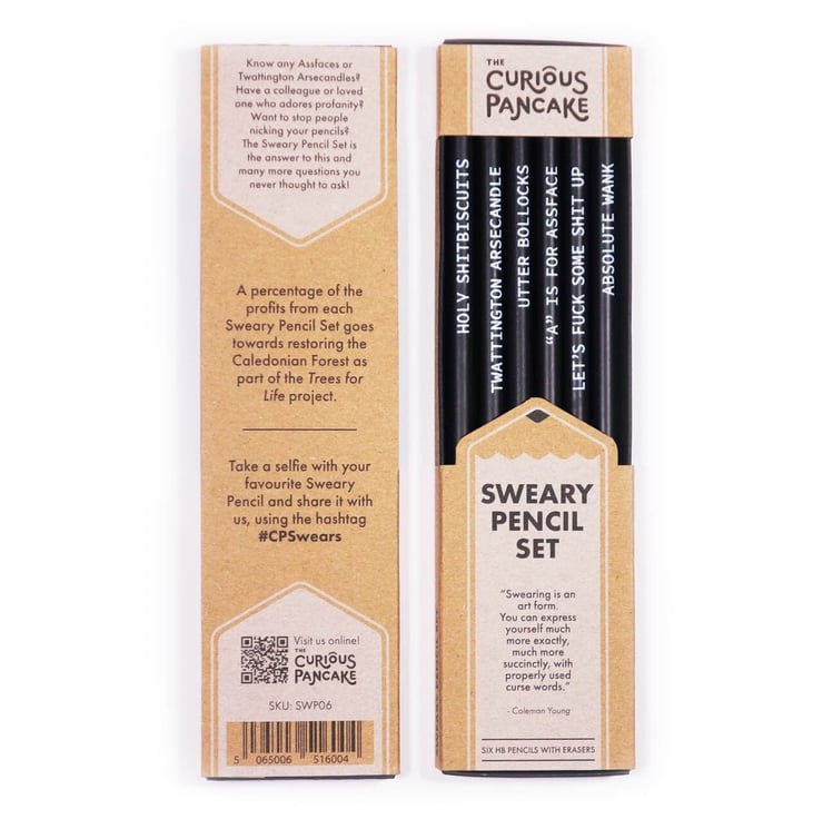 In this plastic-free box set you will find 6 round-barrelled, graphite, sharpened, black pencils (each with a silver ferrule and white eraser). Each pencil has a sweary phrase on it, printed on in white ink. The phrases are: