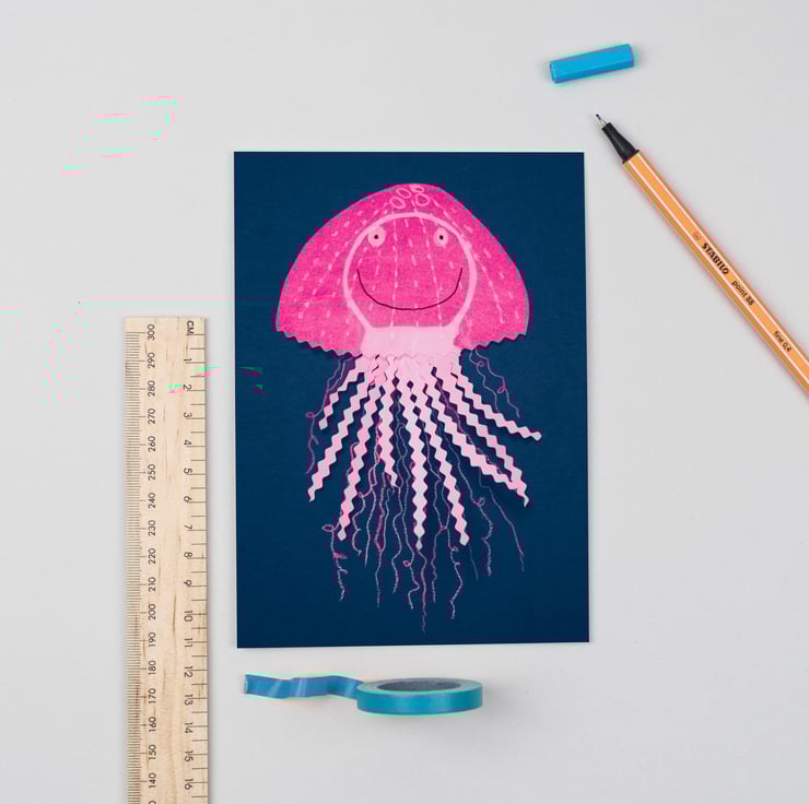What could possibly be cuter than this beaming pink jellyfish?! This card started life as an original cut-out collage. It's the perfect card to send to kids young and old - and great to give to the ocean-loving person in your life!