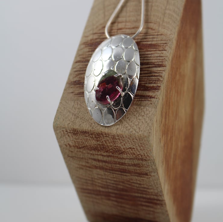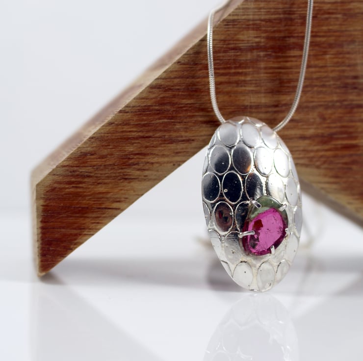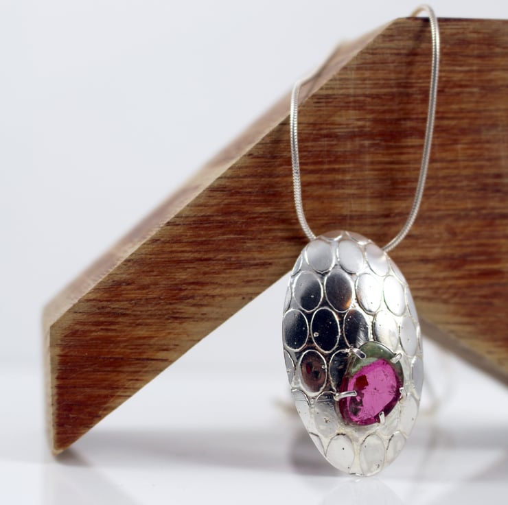 Oval sterling silver pendant etched with an abstract pebble pattern which is shaped into a shield domed form & a high polish finish.