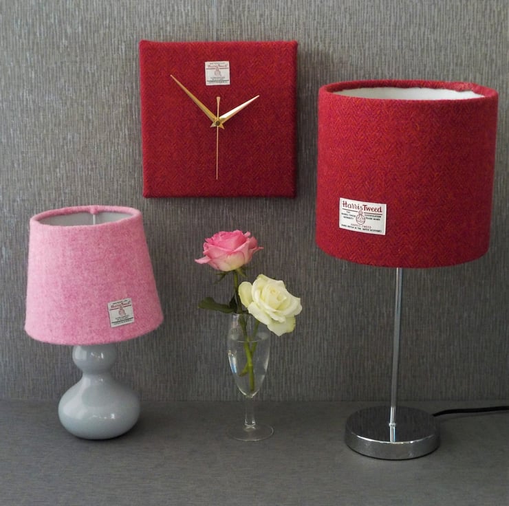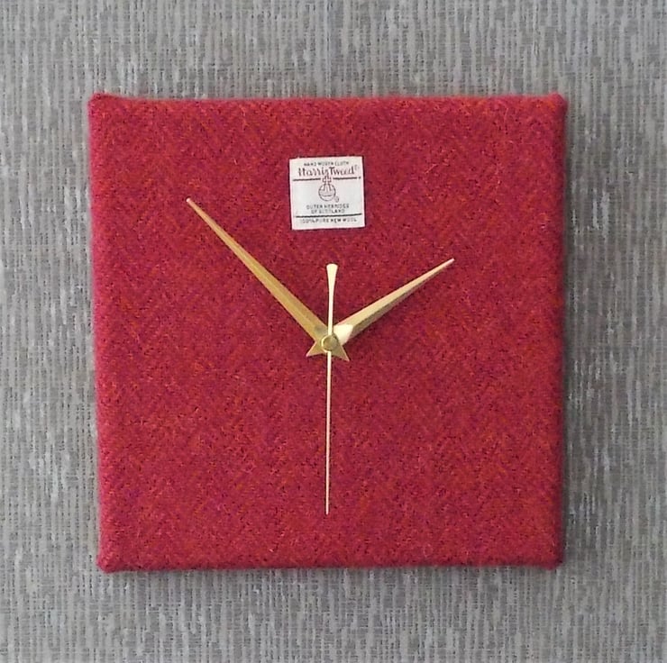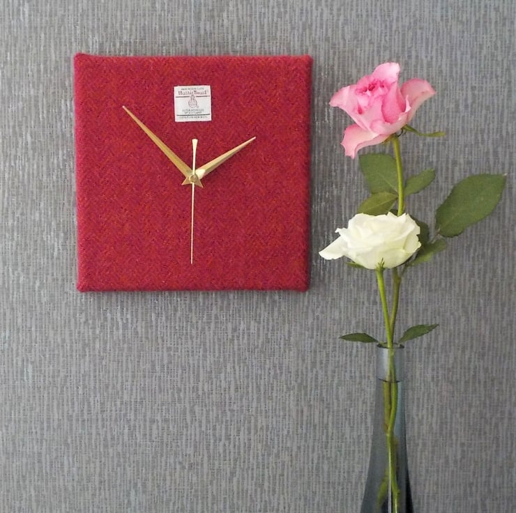 Here's a bright pink clock to brighten your wall! A lovely square wall clock handmade from the world renowned Harris Tweed hand-woven wool fabric in dark pink and orange herringbone.