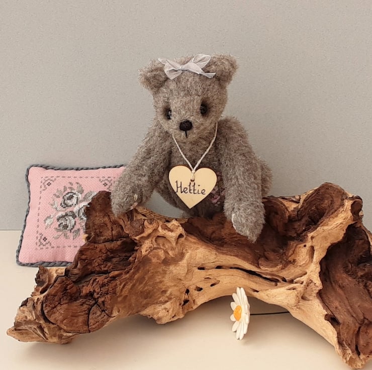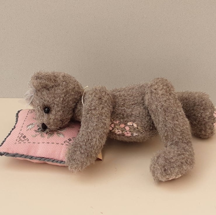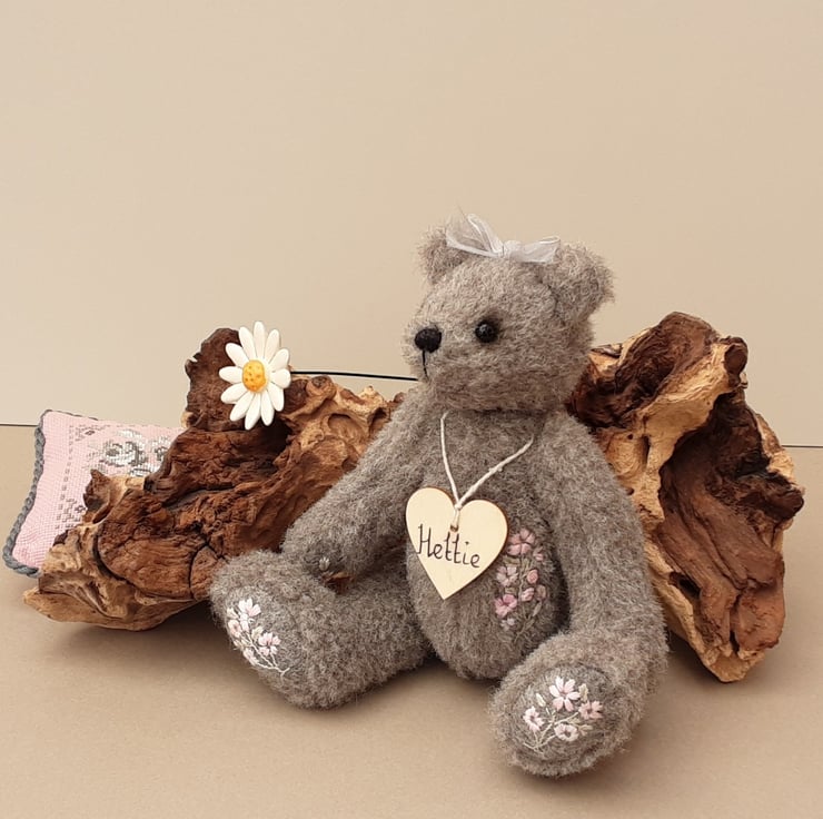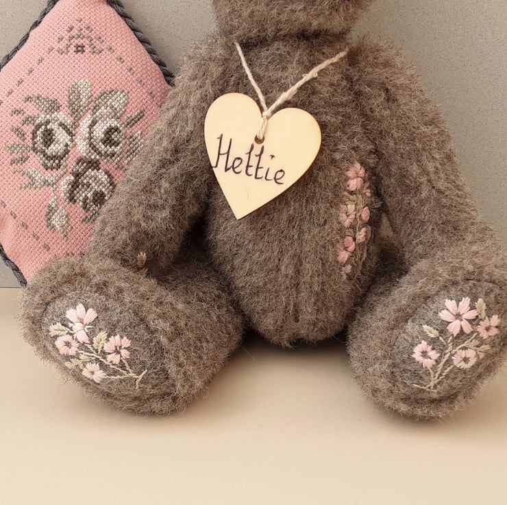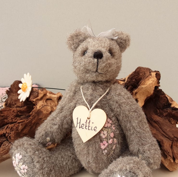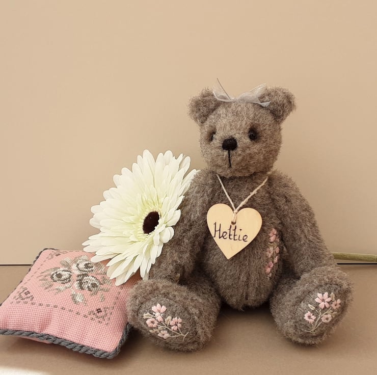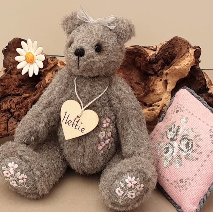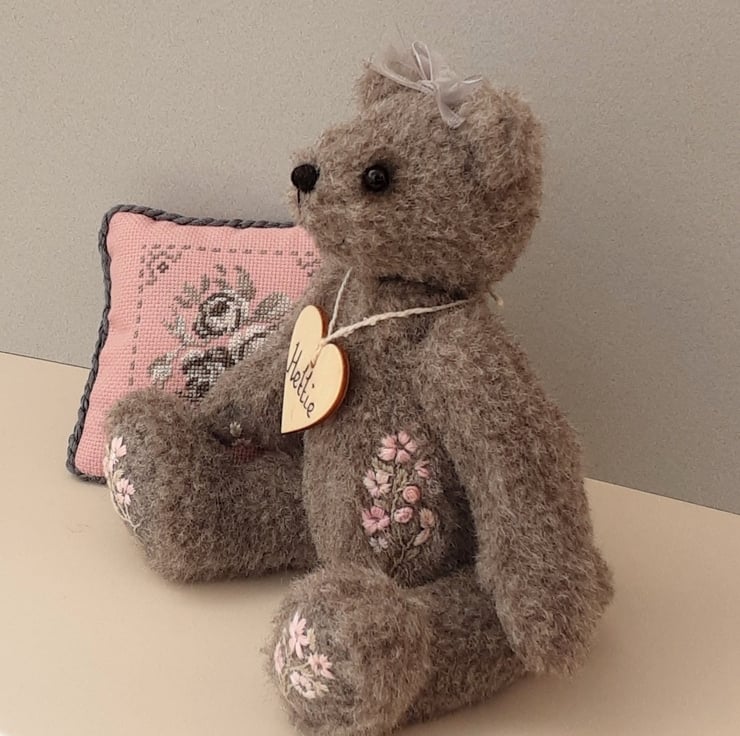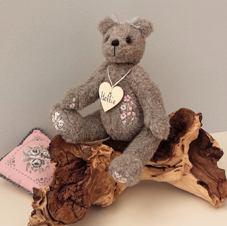 Standing at approx 9.5" tall Hettie is a sweet little bear, handmade from alpaca fur fabric in elephant grey with wool paw pads adorned with hand embroidered flowers in pale pinks. She also has hand embroidery to her body making her a truly unique creation.