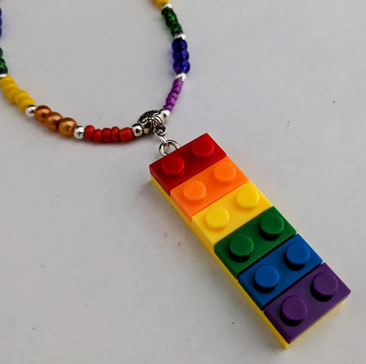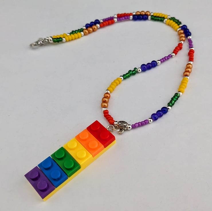 18" handmade necklace of seed beads and 4mm glass pearls in rainbow colours, with a 45x15mm rainbow Lego block pendant.