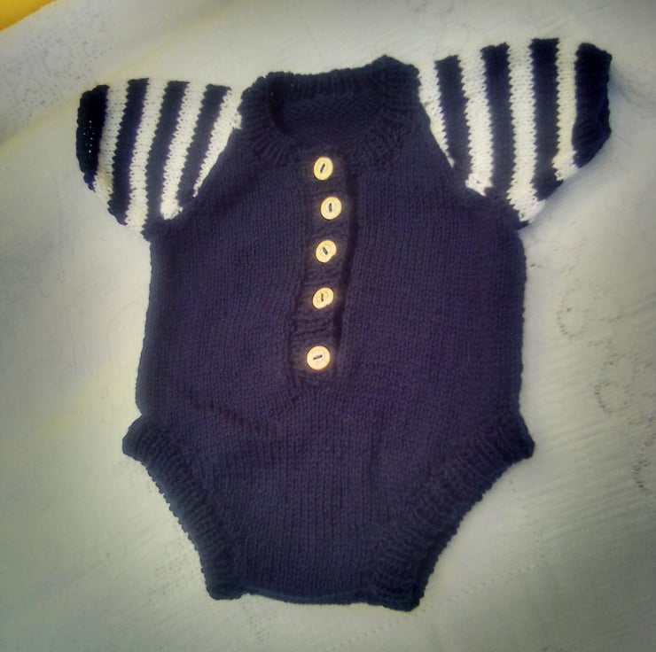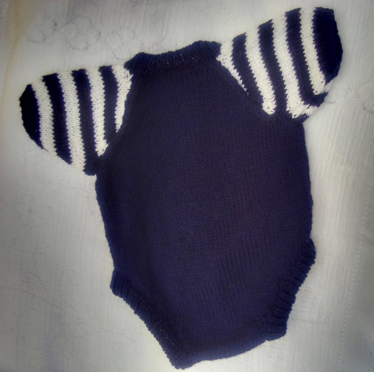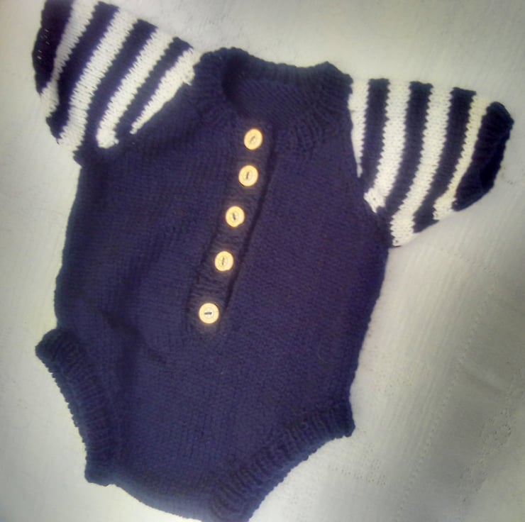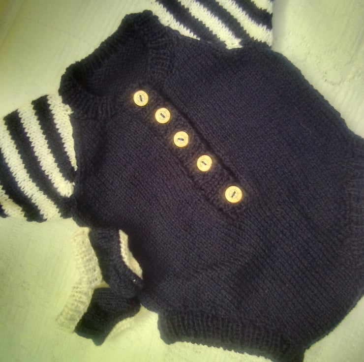 This 2 piece set is in stock in the navy blue and white colour combination shown to fit a premature baby with a 12 inch chest. It can also be made for you in a size to fit a newborn baby with a 14" chest in a colour of your choice, please state the required colour when you order. The processing time for this item is between 1 and 2 weeks.