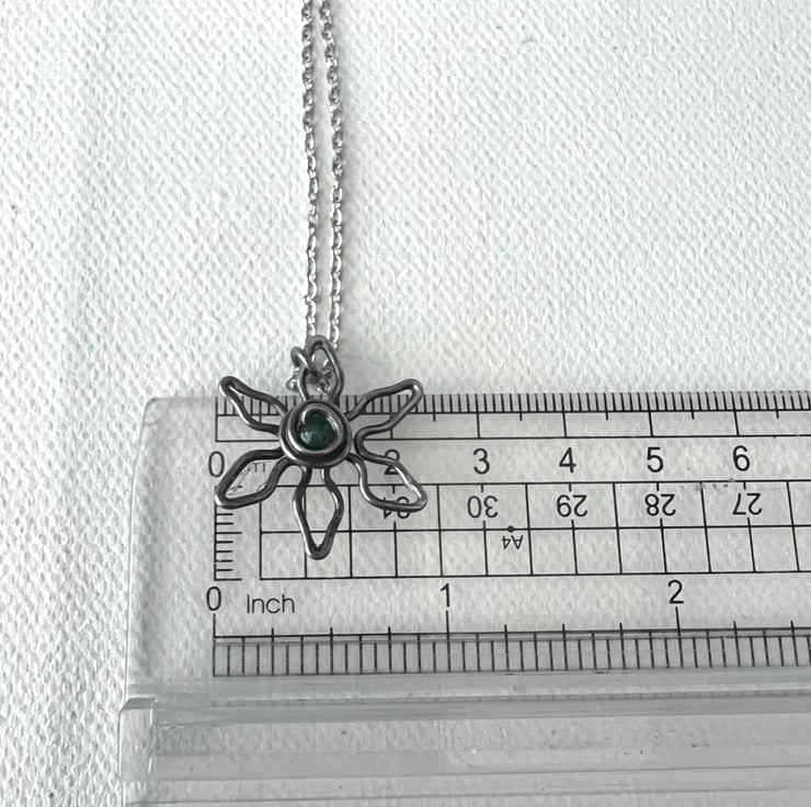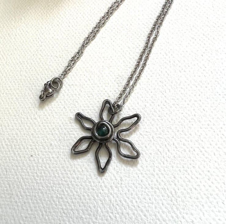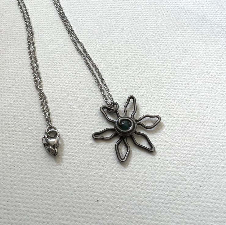 Using bare iron wire, these daisy pendants have been hand turned and shaped into little flowers, hammered to harden the metal, and polished to a high shine. Each daisy has a hand wrapped small 4mm green agate gemstone at its centre. Each pendant is approximately 2.5cm in diameter.