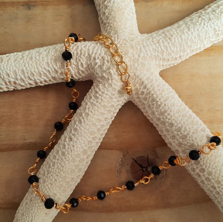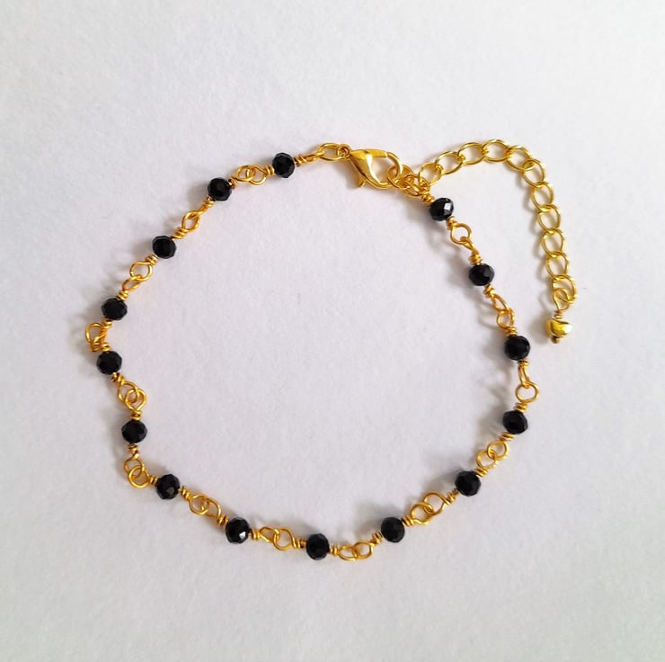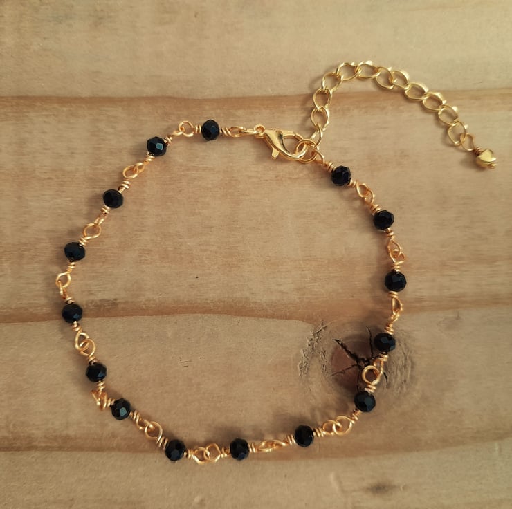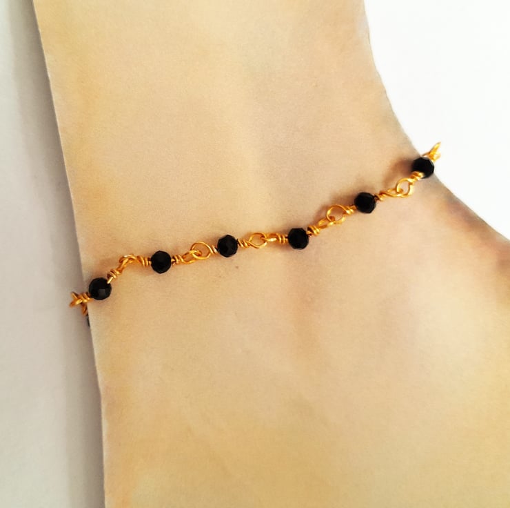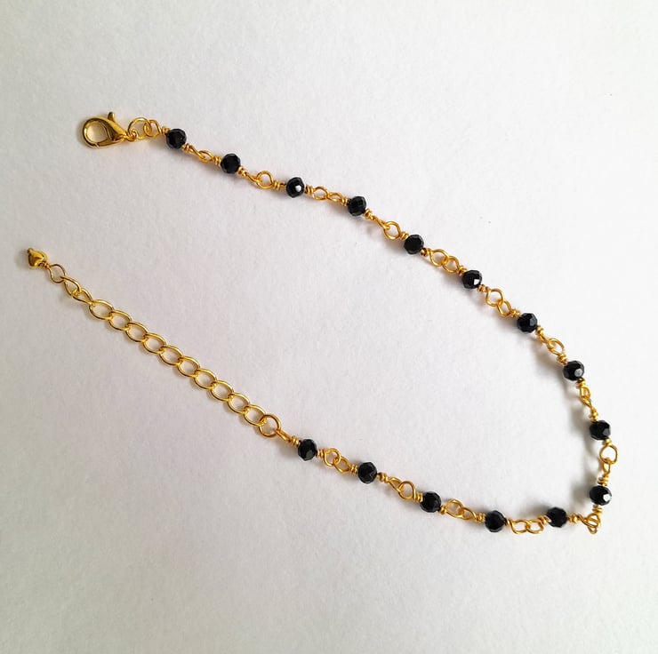 Handmade rosary linked black bead anklet with extender chain. The faceted beads sparkle when they catch the light and are complimented by the gold wire. The anklet fastens with a clasp and has a 2" extender chain finished with a small gold tone heart charm. Each beaded section is finished with wire wrapped by hand.