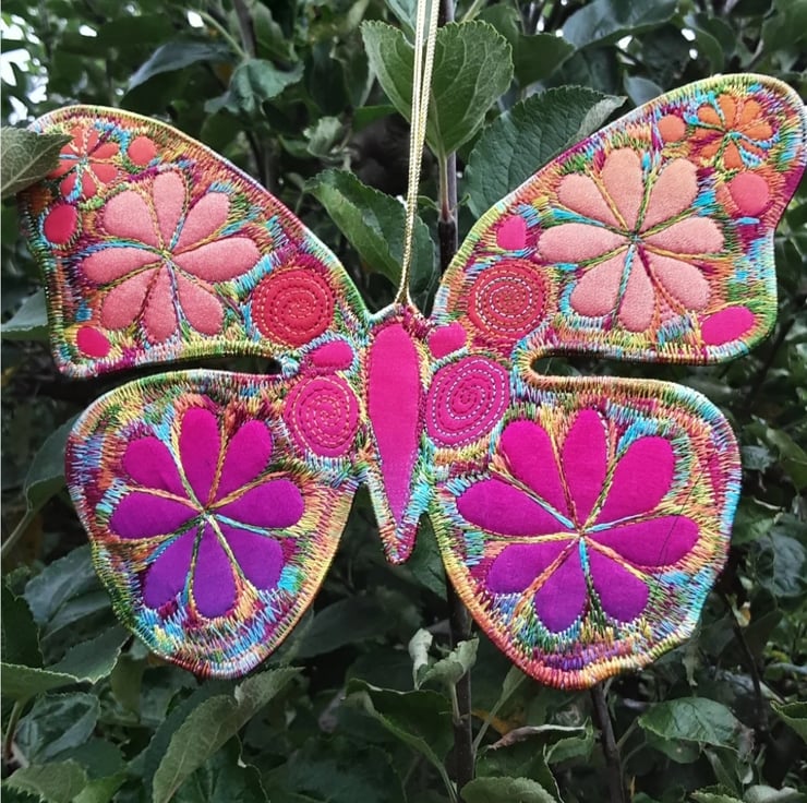Made from layers of fabric including hand dyed Egyptian cotton and silk fabrics using the free machine embroidery style of sewing.