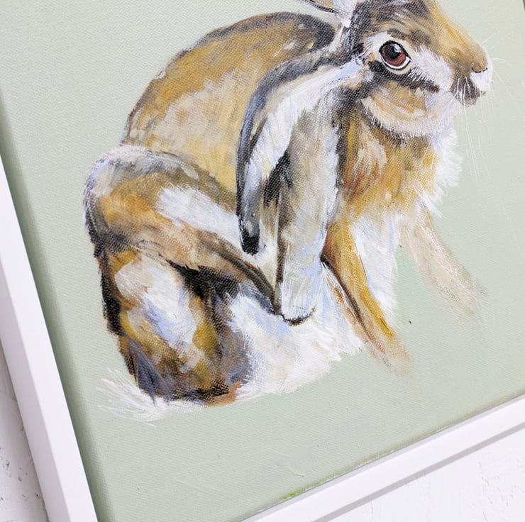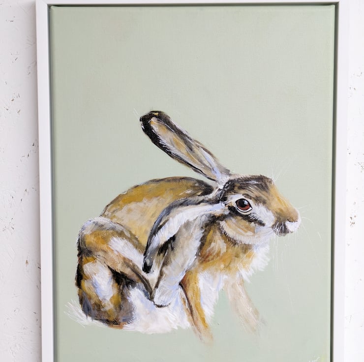 A beautiful original acrylic painting in floating frame from my recent exhibition at a local walled garden. The original photo by french wildlife photographer captured the hare mid scratch and reminded me of Thumper from the film Bambi.