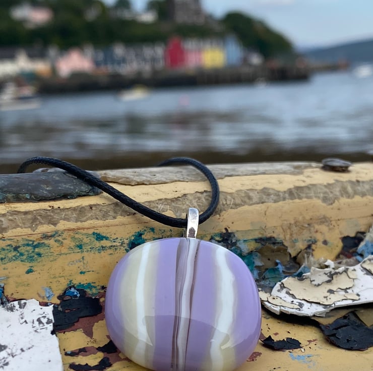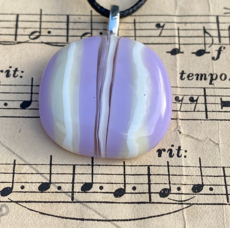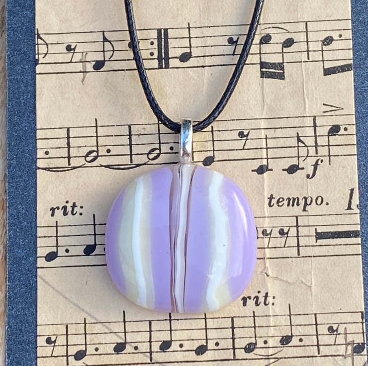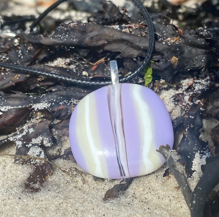 This statement glass pendant with it’s soft lilacs and cream, has the dramatic silvery grey band running through the middle. This amazing addition is as a result of the reactions between the glass as they fuse together. And under different lights the colours of this pendant appear to change from the lilac to a soft blue. Magical!! This sizeable pendant that is just over 1 1/2 inches is presented on a silver colour bail and simple cord necklace