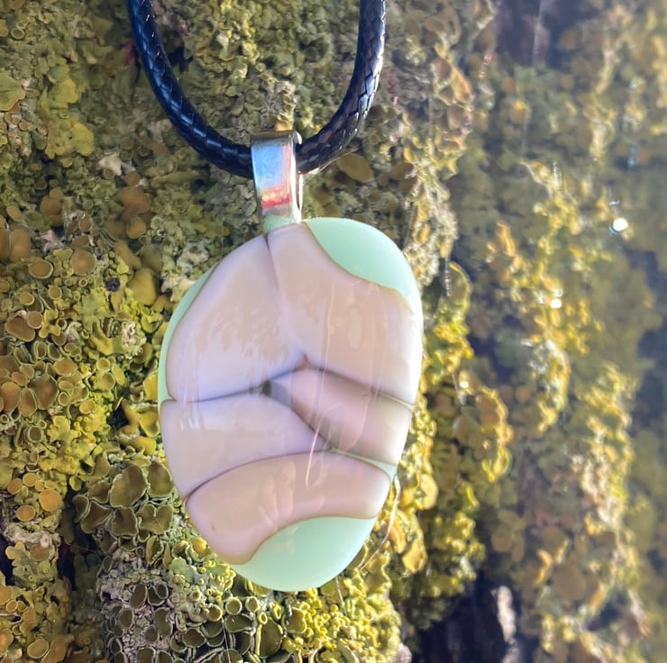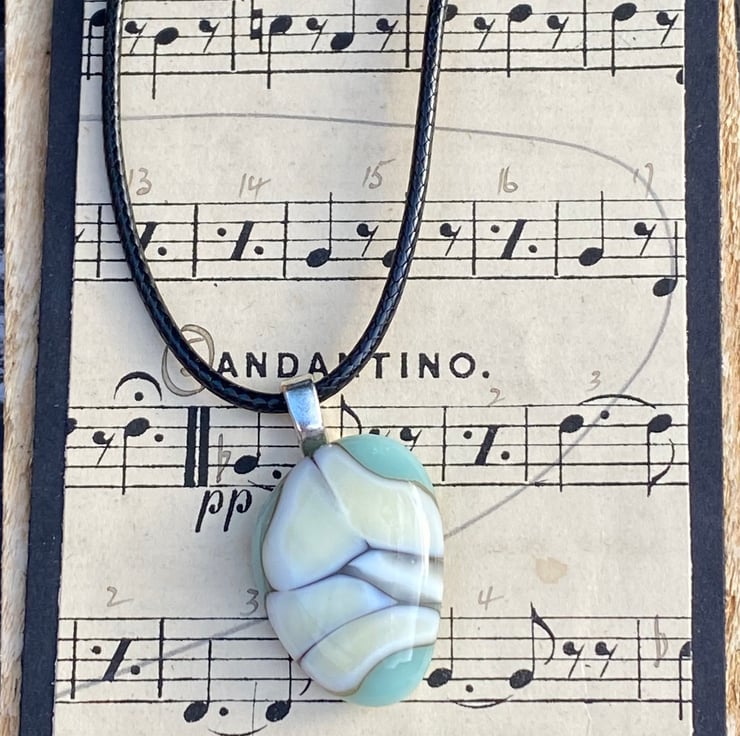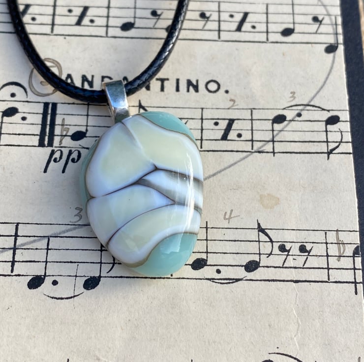 This delicate blue and cream pendant has the dramatic silvery grey highlights that are created during the fusing processes when the different glasses interact! A small pendant at less than 1 inch with a silver coloured bail and simple cord necklace.
