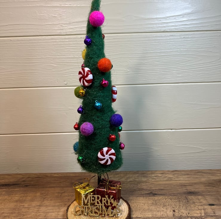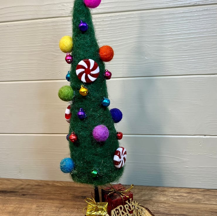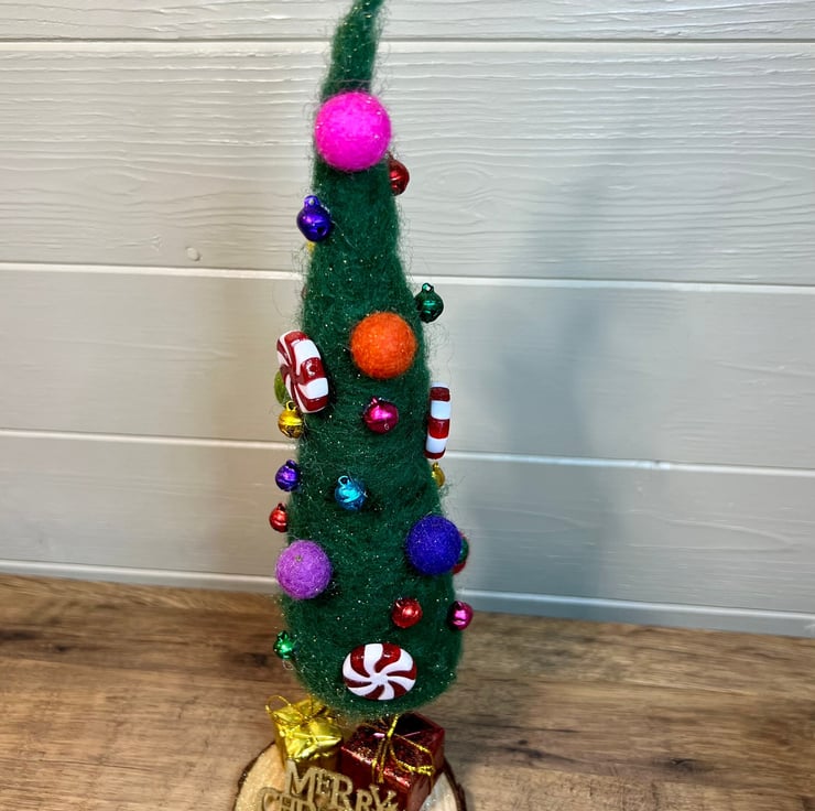 Single dry needle felted Christmas tree decoration adorned with vibrant multicoloured decorations