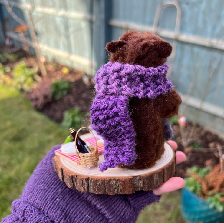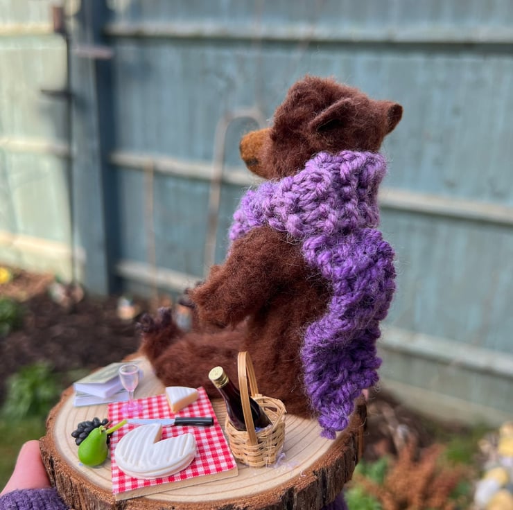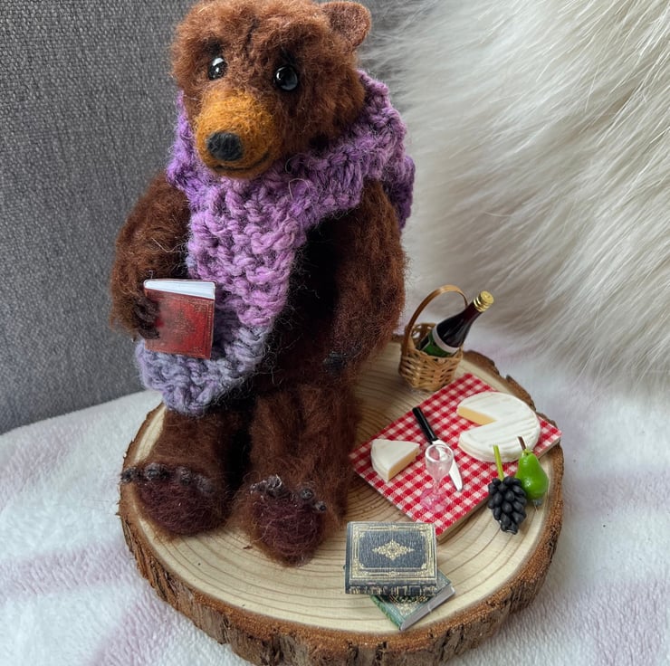 Handmade needle felted scruffy and fluffy teddy bear character, wearing a hand knitted scarf in contrasting colour, in a fun cheese and wine picnic scene.