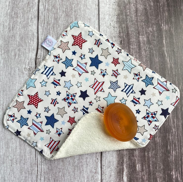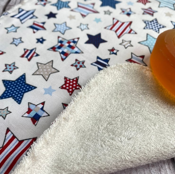A handmade re-useable washable organic Bamboo towelling and 100% cotton fabric (not organic) wash cloth/wipe.
