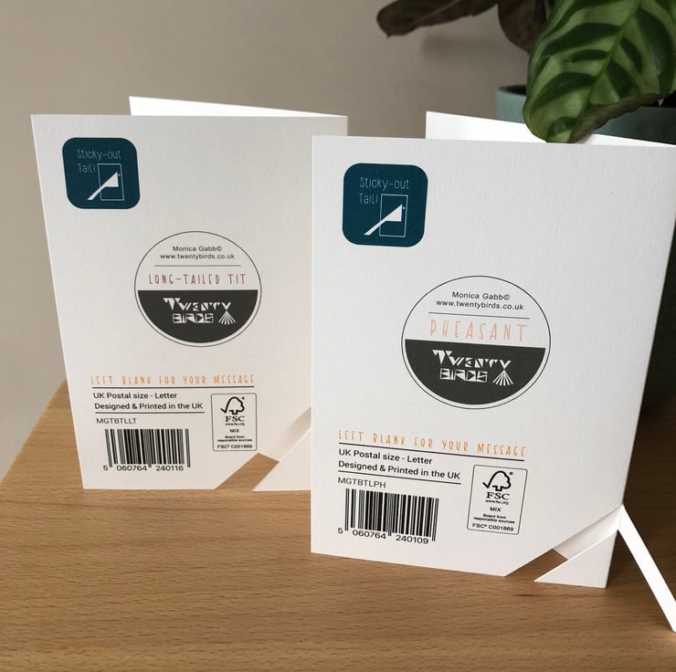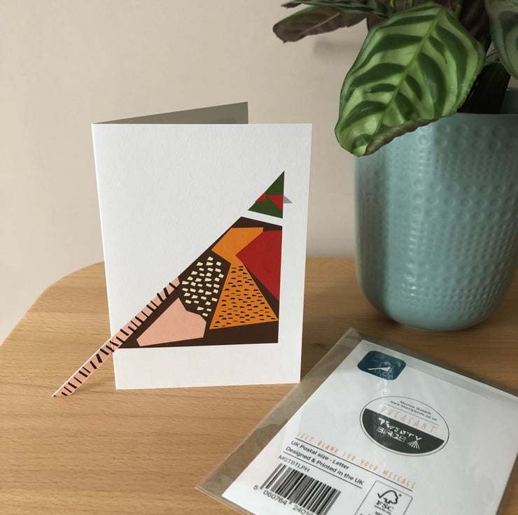 Small A6 card with geometric bird design with unique 'sticky-out Tail' feature. The inside is blank for your message. 300gsm recycled card stock in cellophane pocket to protect the tail.