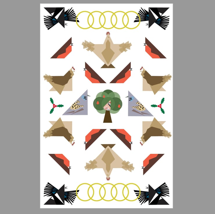 Christmas Tea Towel with 5 stages of the twelve days of Christmas: