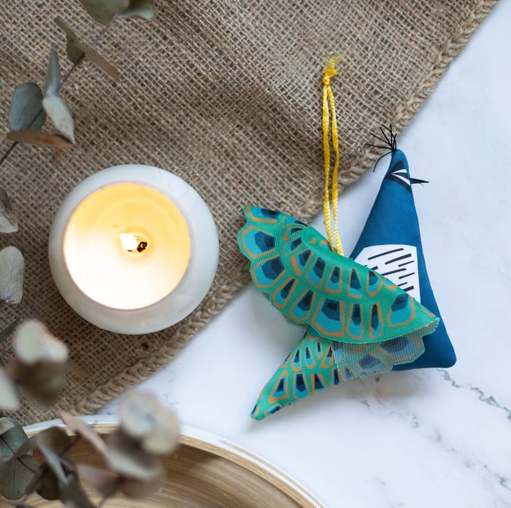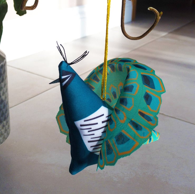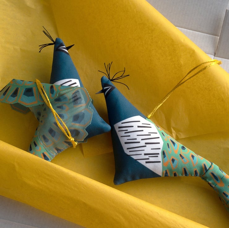 Peacock Christmas Decoration with his tail up These are made with digitally printed scuba fabric, have a leather beak, a waxed cord tuft and a glossy yellow hanging loop.