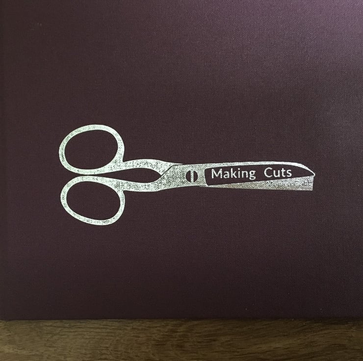 Hand-bound book including scissor and cutting puns. This book is litho printed and folded into pages from 1 A2 piece. Hardback- bound by hand at R Grech Bindery in Shipley. This A5 book has a foiled title and foiled text on the back.
