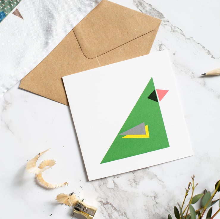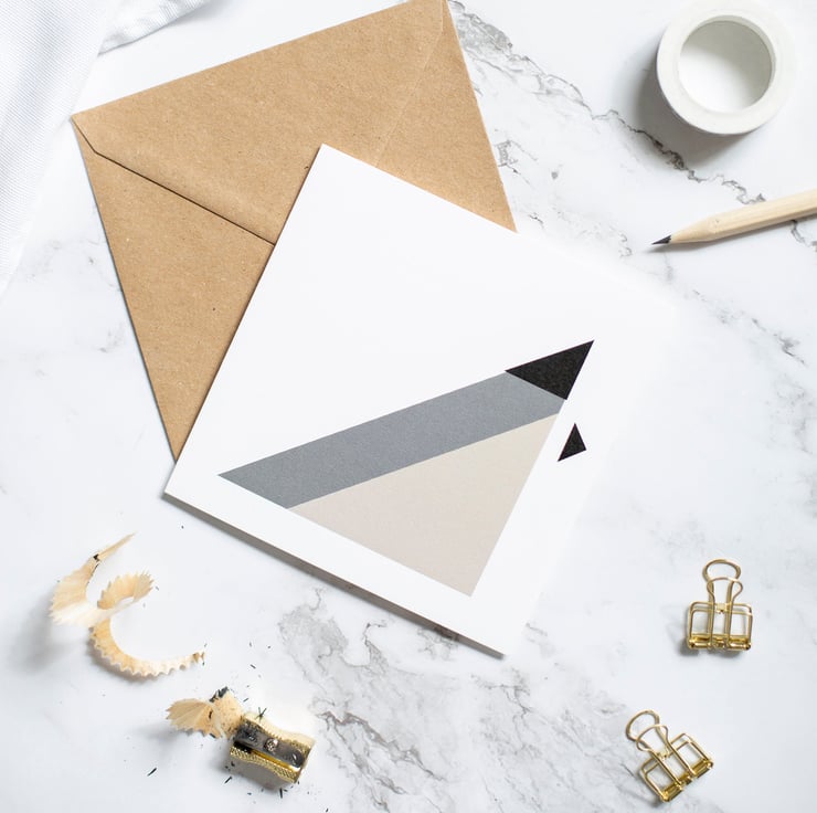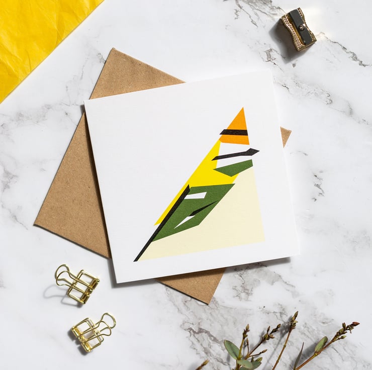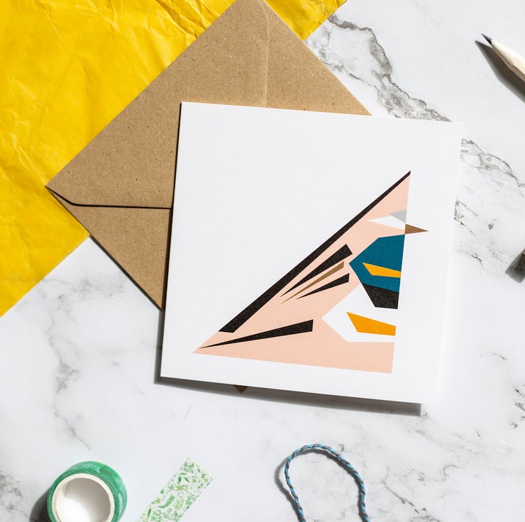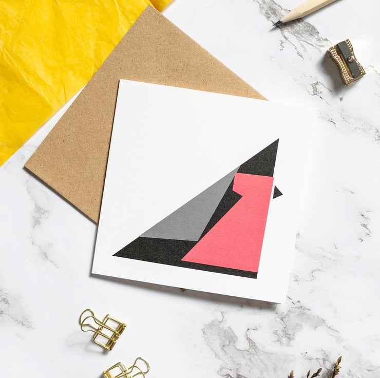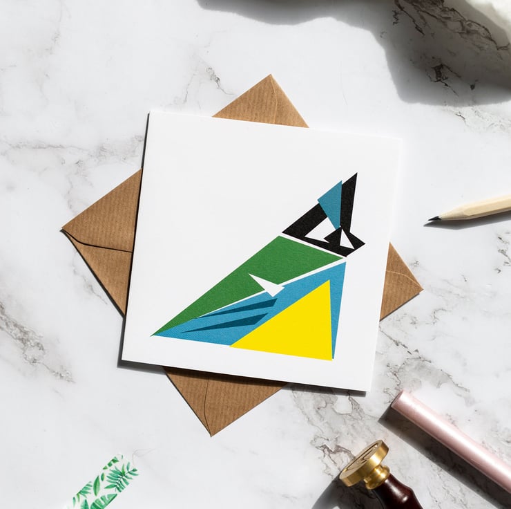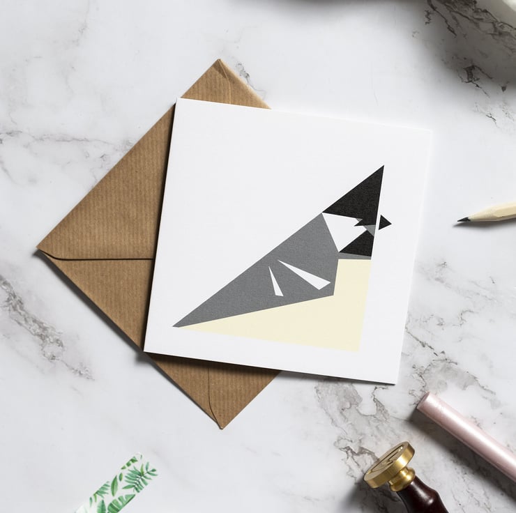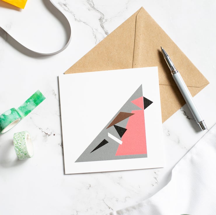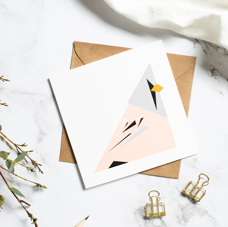 6 x Small 125 x 125mm card with different geometric bird designs. The inside is blank for your message. 300gsm recycled card stock with Kraft envelope in cellophane pocket.