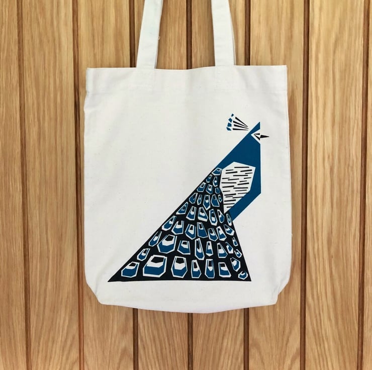 Peacock Tote. Two colour screen printed Stanley Stella thick 80% cotton 20% polyester recycled fabric.