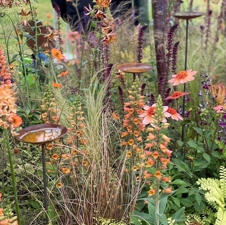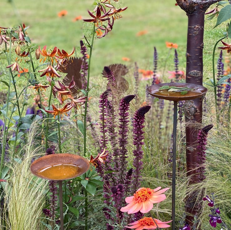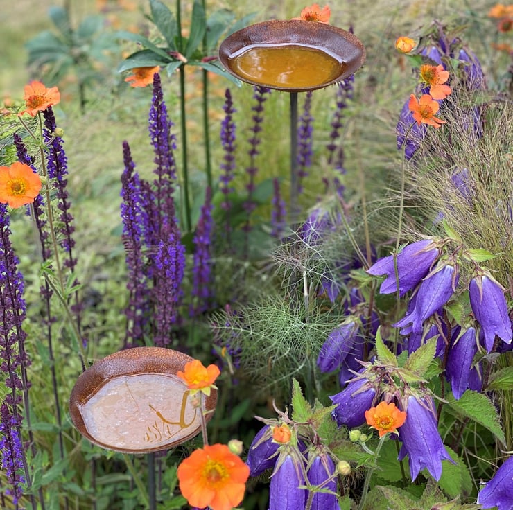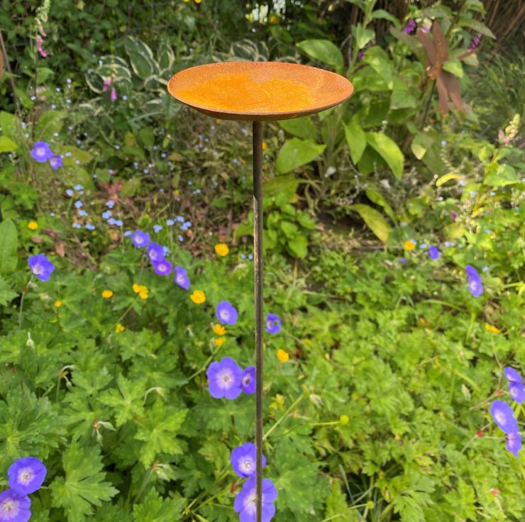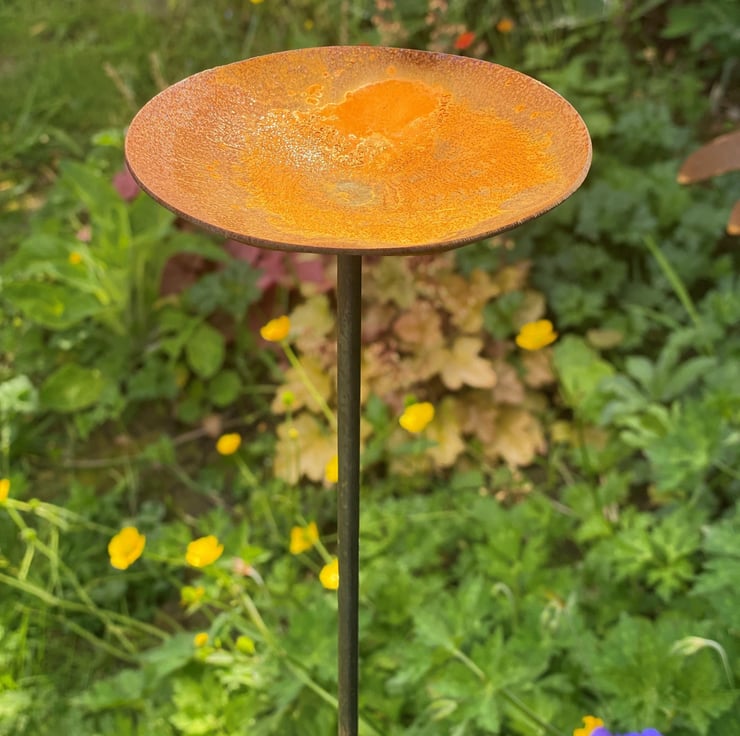 Handmade rusty corten (weathering steel) metal rain catcher. Made from corten so rust will not contaminate the water. Add all year round interest to your garden with our attractive rusty rain catcher garden decoration. As featured in The Bearded Botanist 'Pretty Wild' border at BBC Gardeners' World Live 2022.