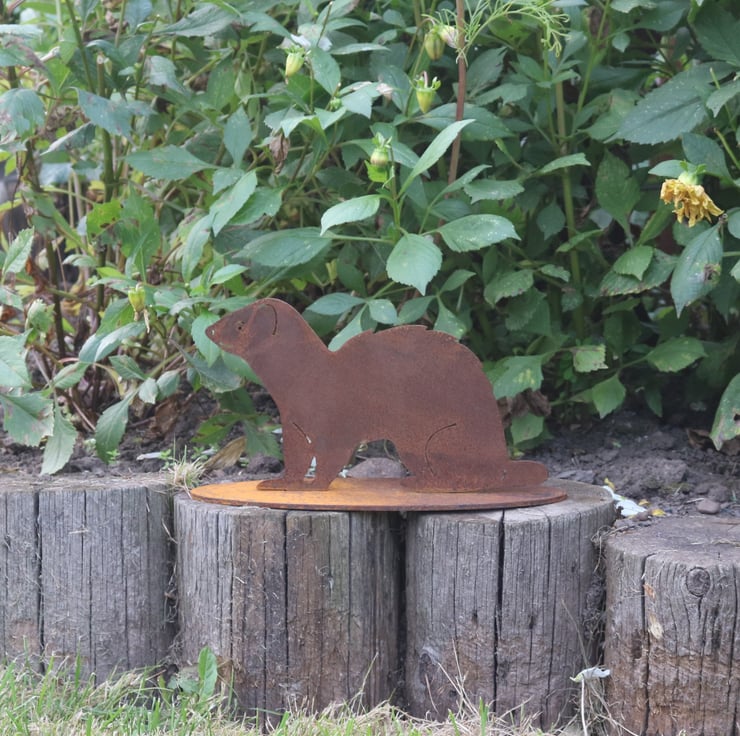 Bespoke rusty metal ferret garden ornament, ferret garden decoration, ferret memorial. Approx size ferret 25cm wide x 15cm high mounted on a rusty metal stand approx 29cm x 9.5cm
